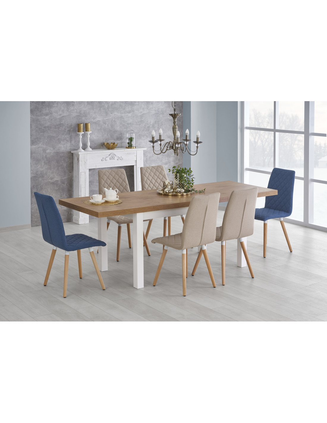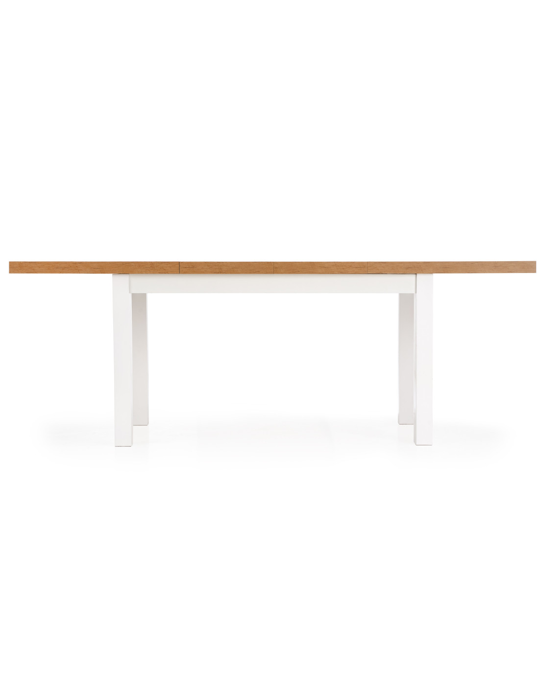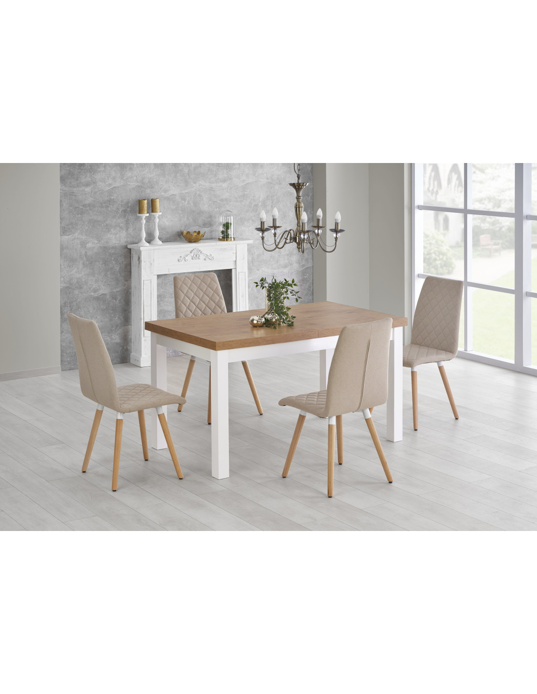 Wybierz rozszerzany stół TIAGO, który łączy w sobie nowoczesny design z niepowtarzalnym urokiem naturalnego drewna! Blat w kolorze dębu lancelot o gładkiej, prostokątnej powierzchni, wykonany z płyty meblowej laminowanej, to kwintesencja elegancji. Dodatkowo, białe, proste nogi ze litego drewna bukowego nadają mu lekkości i charakteru, idealnie komponując się z różnorodnymi aranżacjami wnętrz.