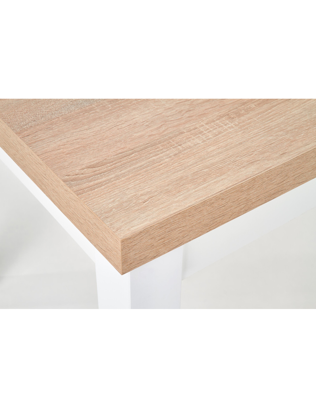 Nogi stołu wykonane są z litego drewna bukowego w kolorze białym. Blat stołu wykonany jest z wysokiej jakości wytrzymałej na uszkodzenia oraz łatwej do utrzymania w czystości płyty MDF laminowanej.