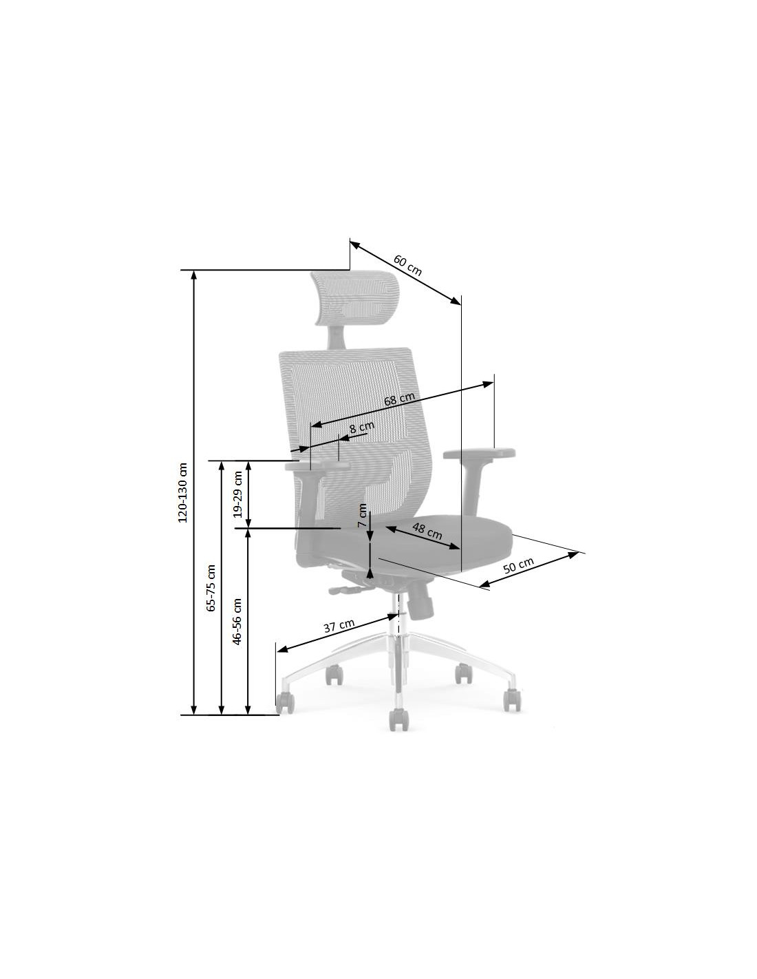 Szerokość wynosi 64 cm, głębokość 60 cm, a wysokość to 120-130 cm, z możliwością regulacji wysokości siedziska od 46 do 56 cm.