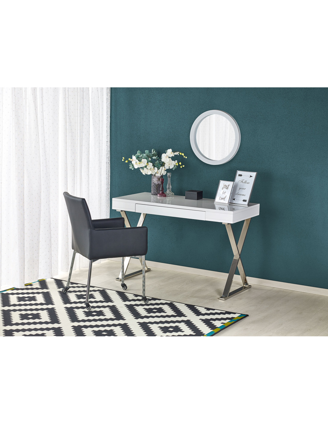 Sprawdź biurko B31, które łączy elegancki nowoczesny design z praktycznymi rozwiązaniami. Białe wykończenie w połączeniu z chromowanymi nogami w kształcie litery "X" nadaje mu wyjątkowego charakteru, a prostokątny blat wykonany z MDF lakierowanego na wysoki połysk sprawia, że jest nie tylko estetyczne, ale i łatwe w utrzymaniu. Dzięki jednej szufladzie masz zawsze pod ręką wszystkie niezbędne akcesoria.