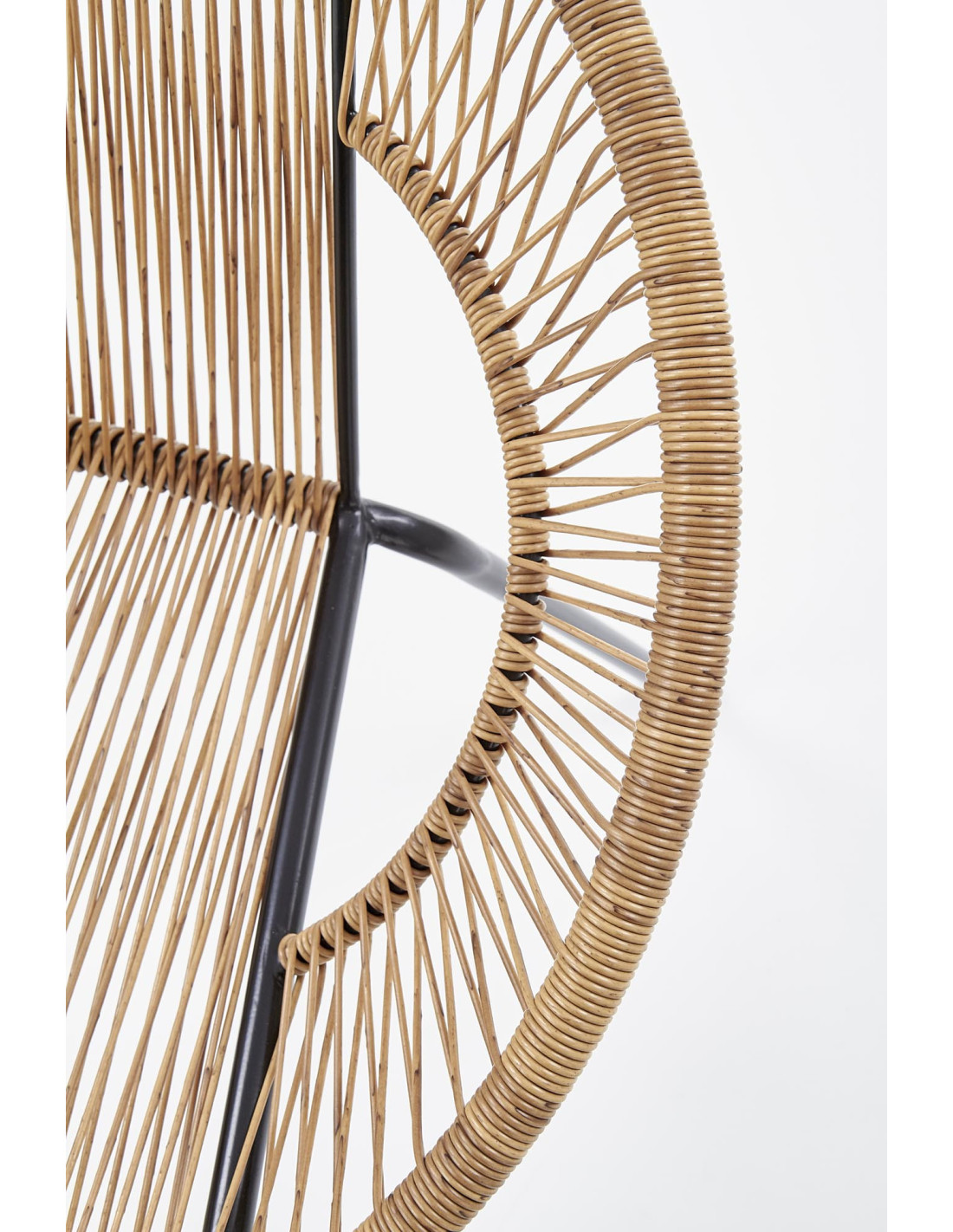 Fotel BARI charakteryzuje się plecionym siedziskiem, zaokrąglonym kształtem oraz eleganckimi czarnymi nogami ze stali.
