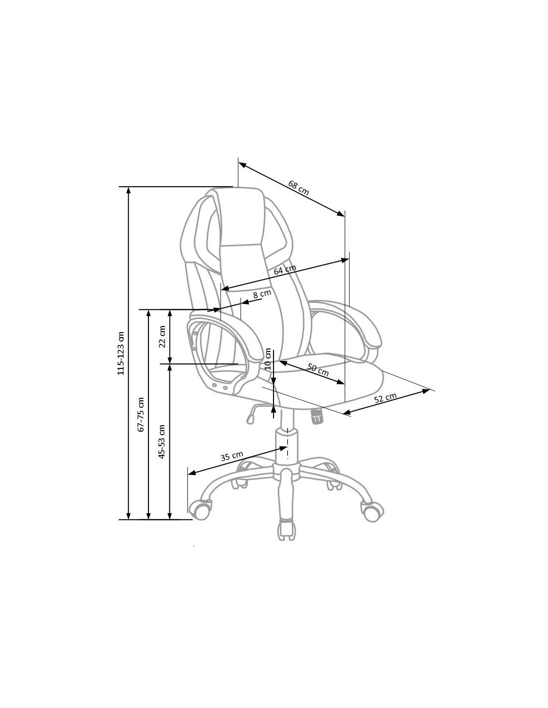Szerokość wynosi 64 cm, głębokość to 68 cm, a wysokość regulowana mieści się w przedziale od 115 do 123 cm, z możliwością regulacji wysokości siedziska od 45 do 53 cm.