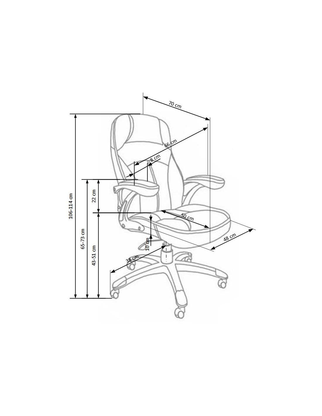 Szerokość wynosi 66 cm, głębokość 70 cm, a wysokość to 106-114 cm, z możliwością regulacji wysokości siedziska od 43 do 51 cm.