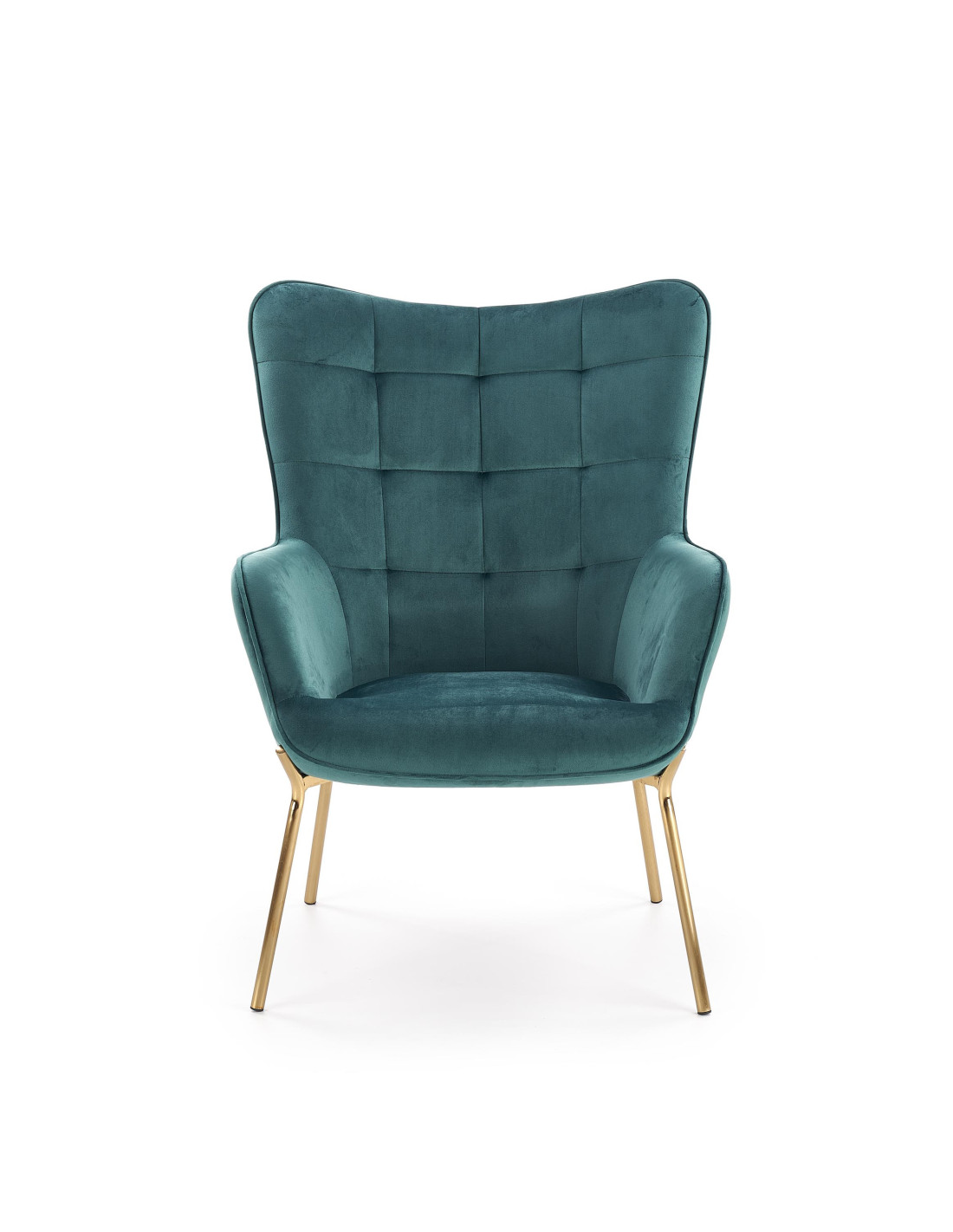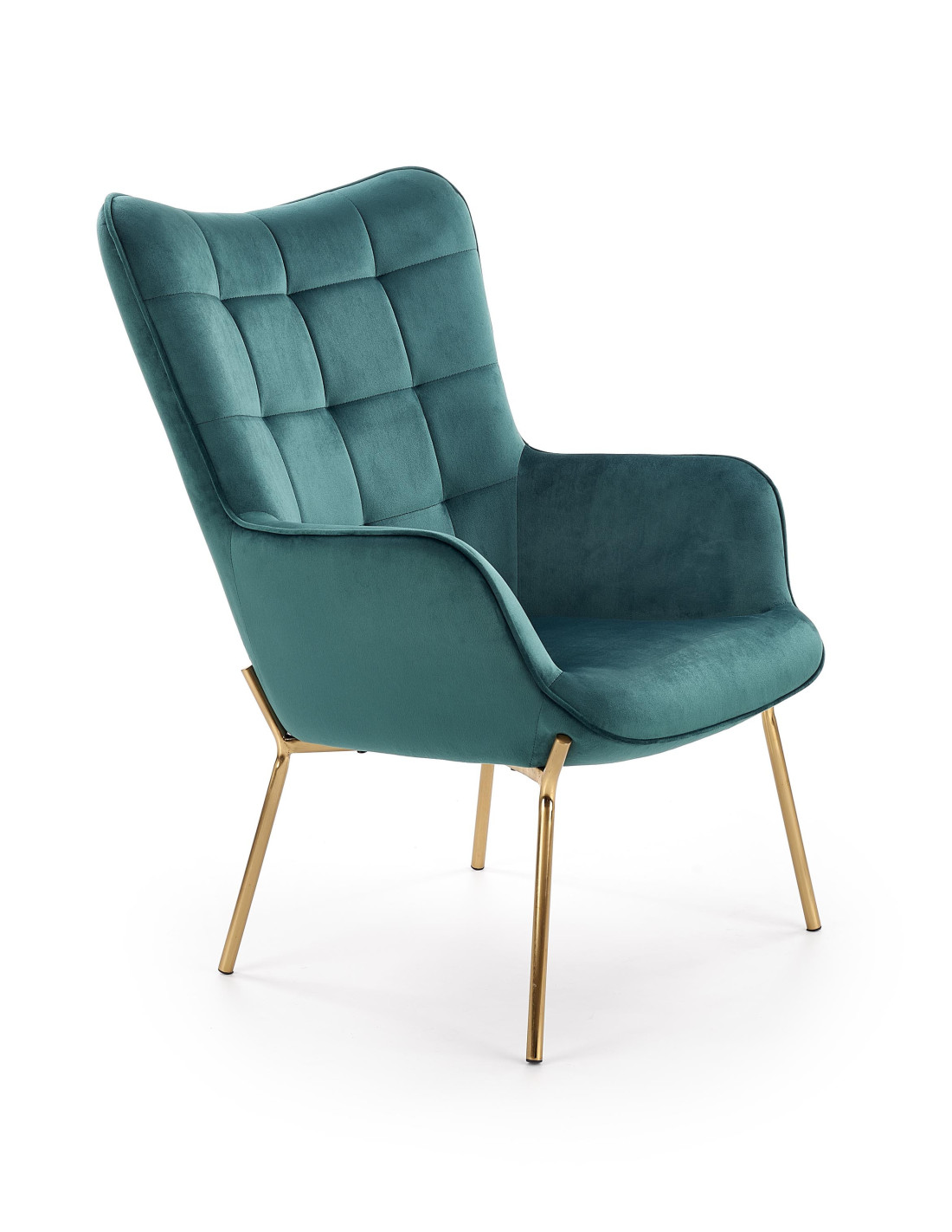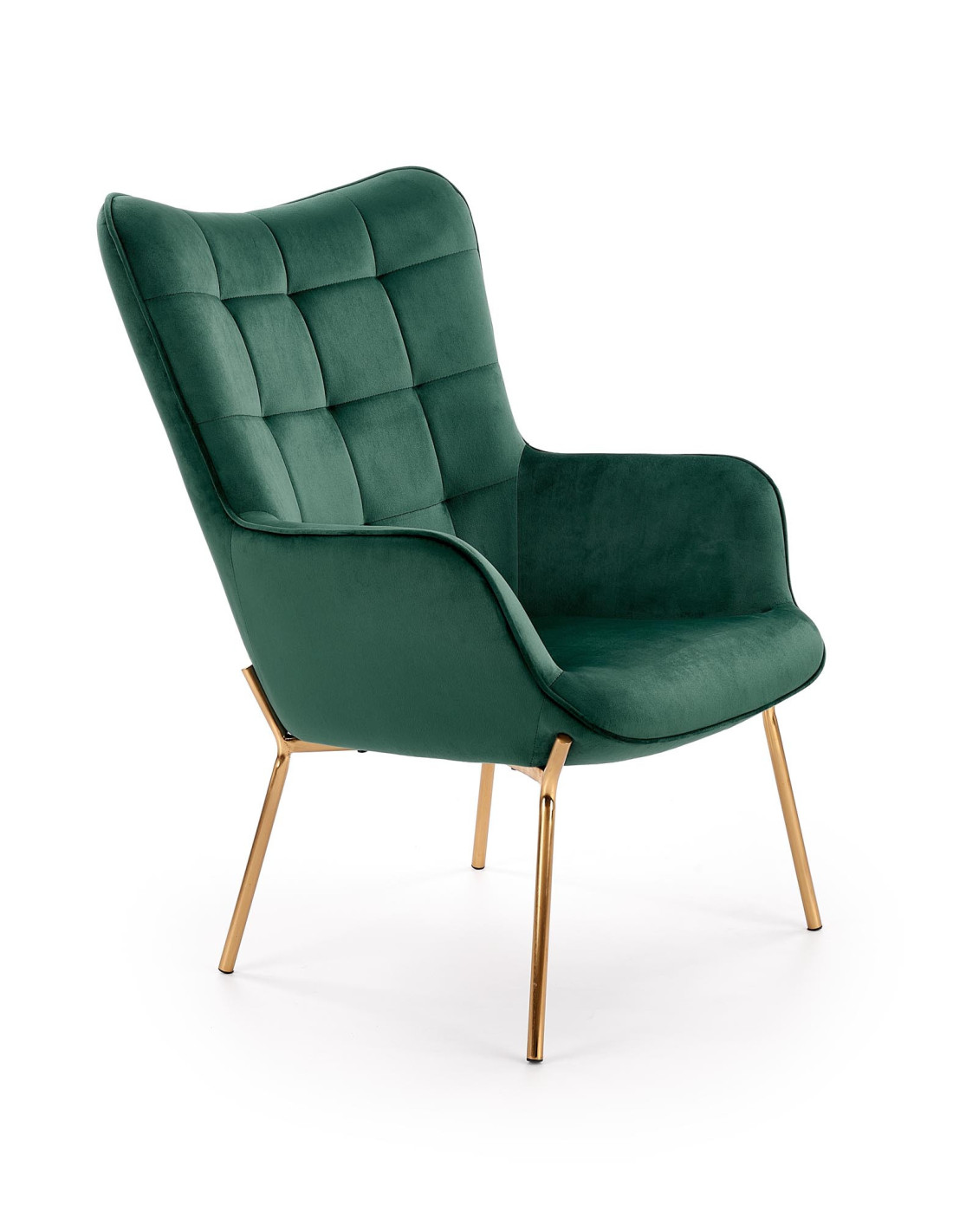 Fotel CASTEL wykonany jest z aksamitu w kolorze ciemnozielonym oraz stalowych nóg w złotym wykończeniu.