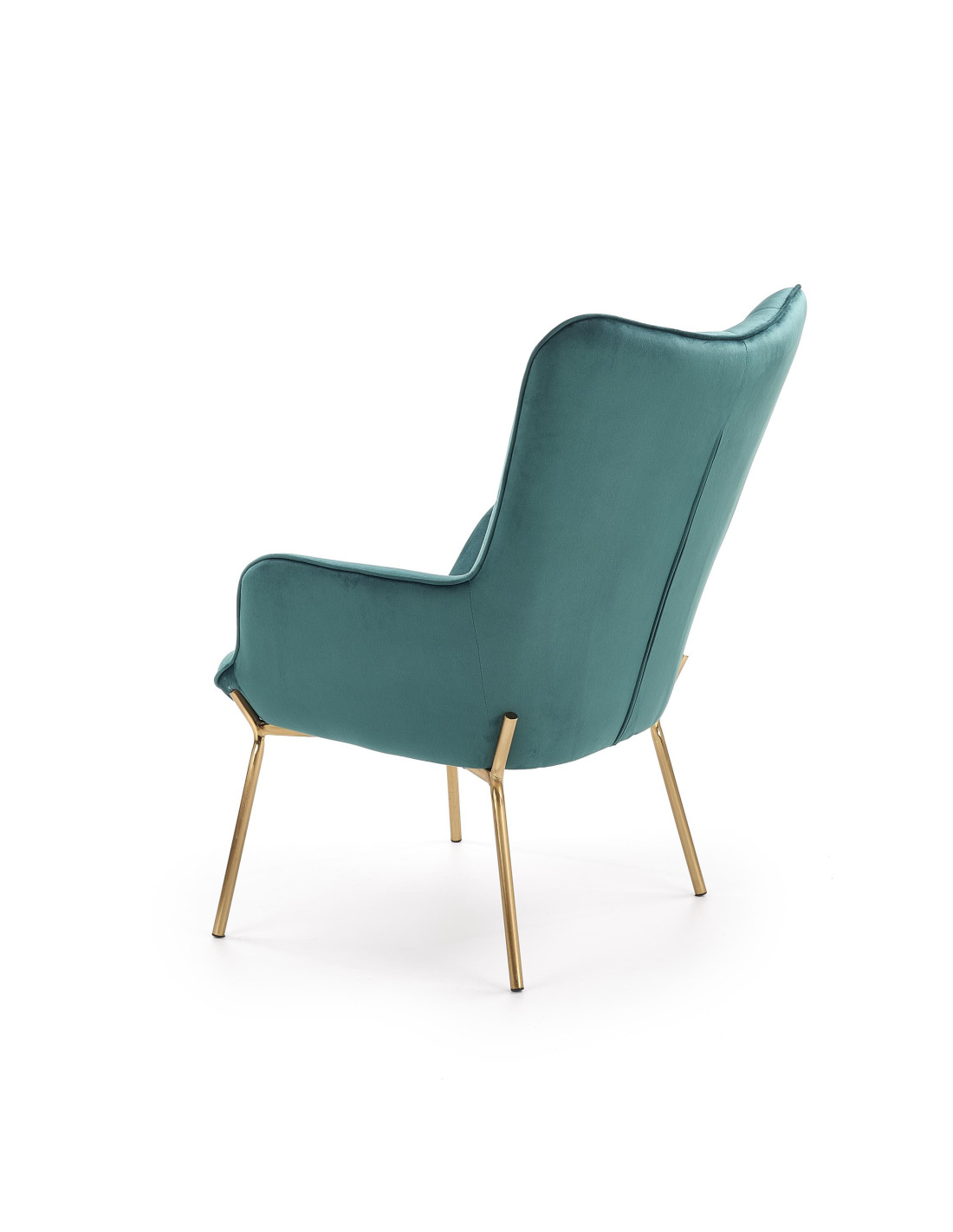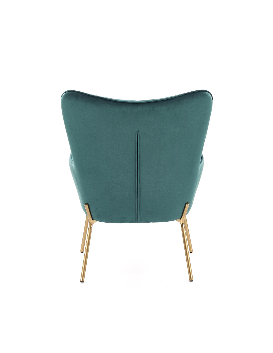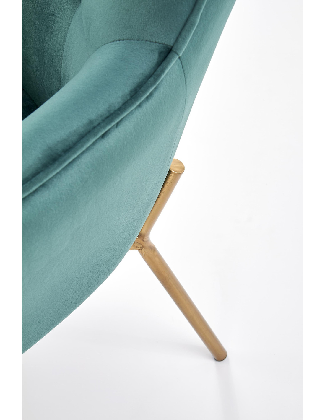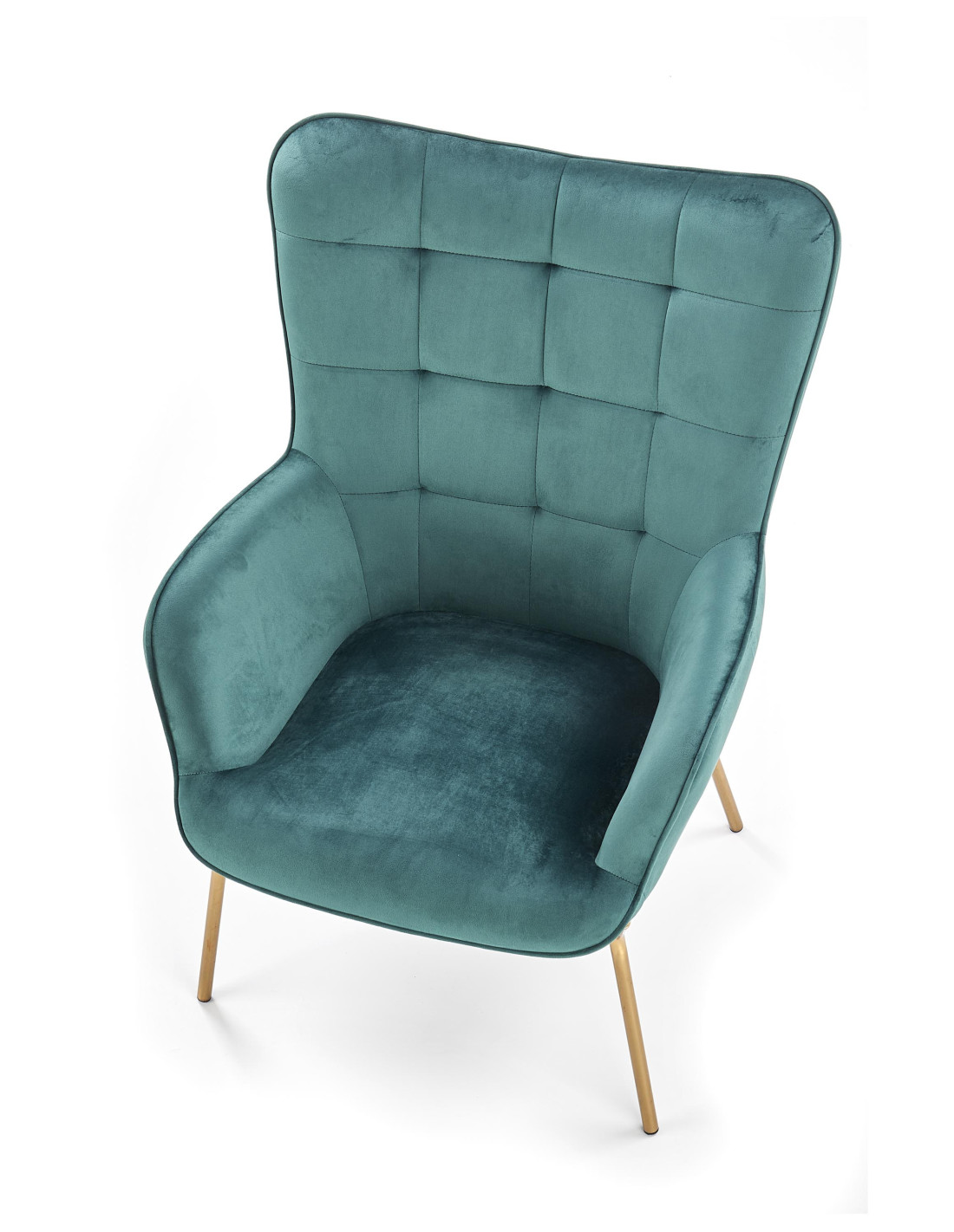 Fotel CASTEL wykonany jest z aksamitu w kolorze ciemnozielonym oraz stalowych nóg w złotym wykończeniu.