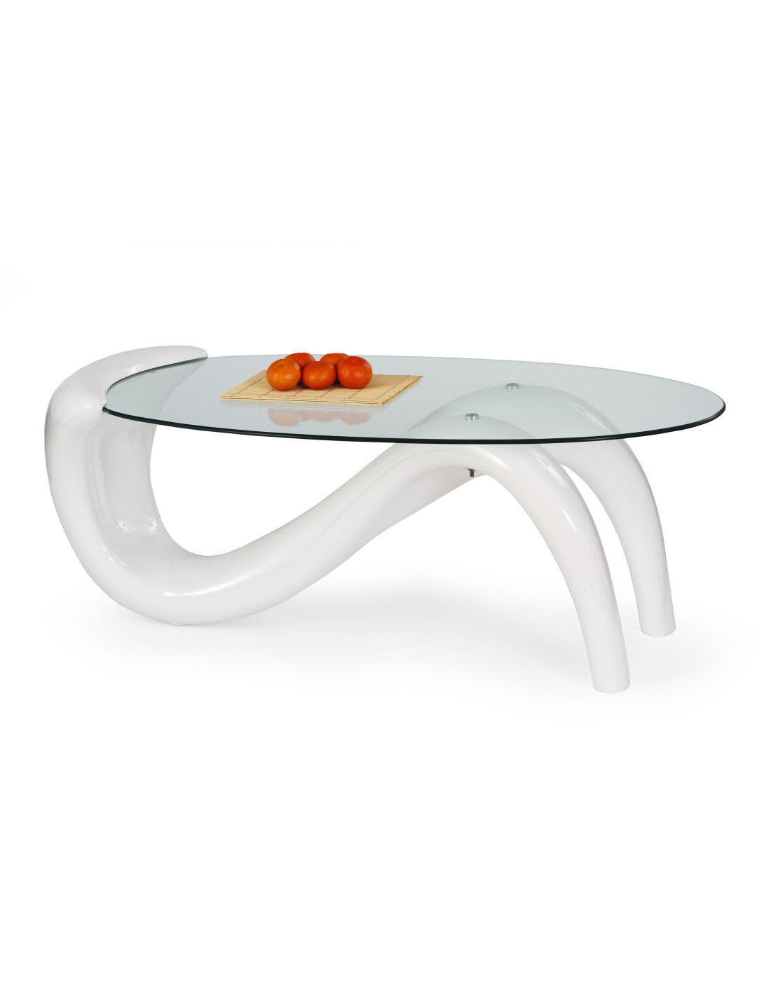Ława posiada owalny blat wykonany z wysokiej jakości szkła, który świetnie komponuje się z pozostałym jej elementem. Podstawę stołu wykonani z włókna szklanego barwionego na biało.