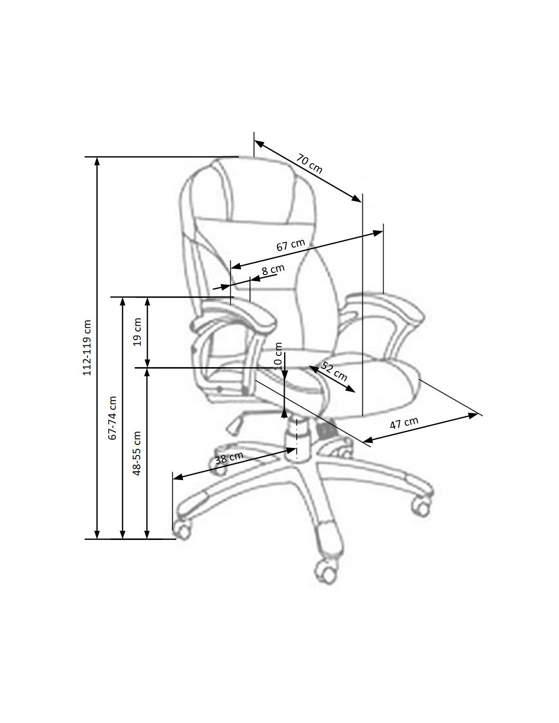 Szerokość wynosi 67 cm, głębokość 70 cm, a wysokość to 112-119 cm, z możliwością regulacji wysokości siedziska od 46 do 53 cm.