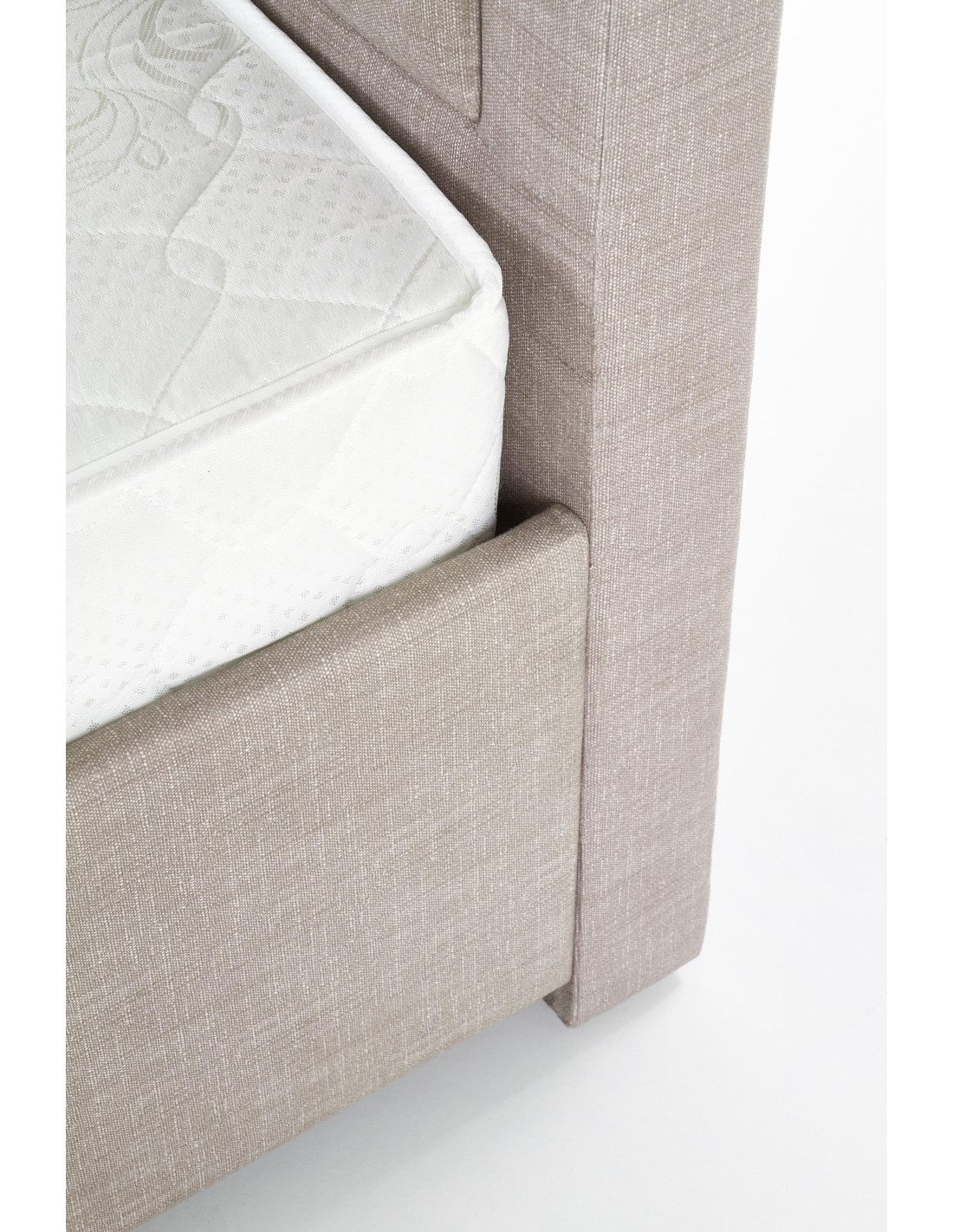 Łóżko EVORA wykonane jest z tkaniny w kolorze beżowym oraz drewna litego w kolorze orzechowym.