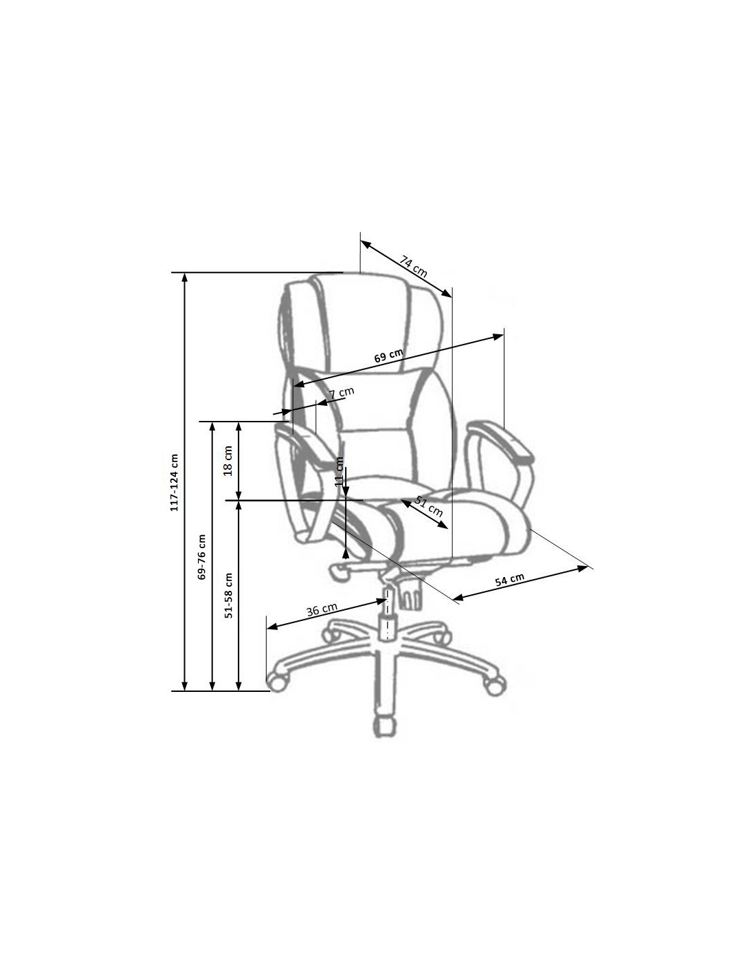 Szerokość wynosi 68 cm, głębokość 54 cm, a wysokość to 118-125 cm, z możliwością regulacji wysokości siedziska od 48 do 55 cm.