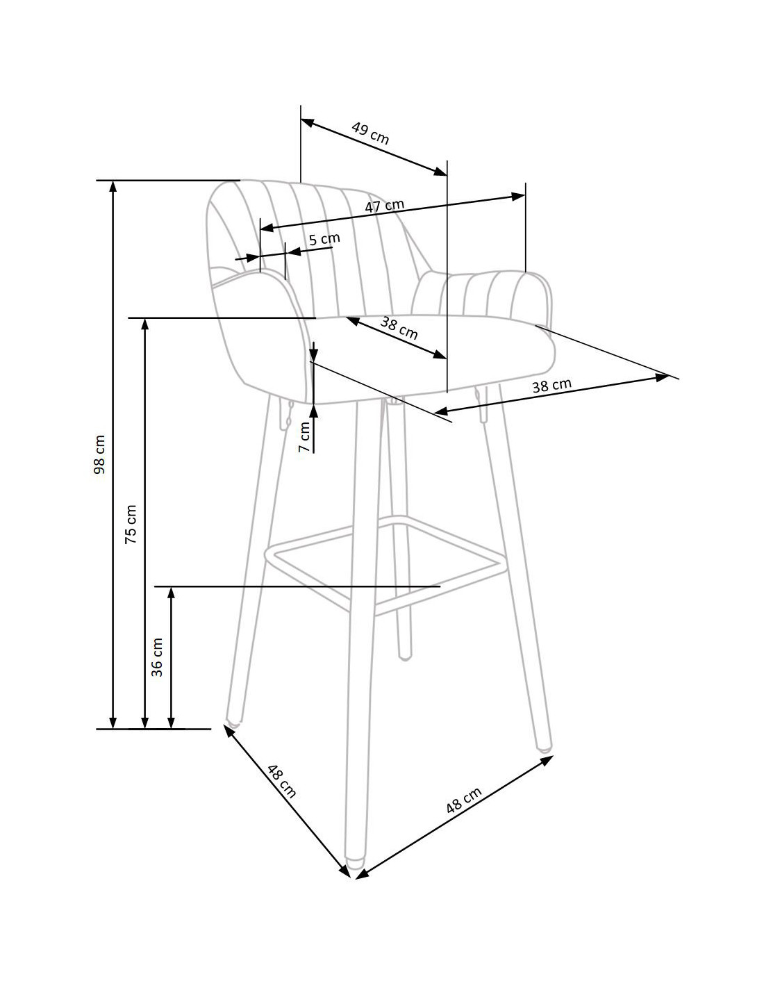Szerokość wynosi 47 cm, głębokość 49 cm, wysokość 98 cm, a wysokość siedziska to 75 cm.