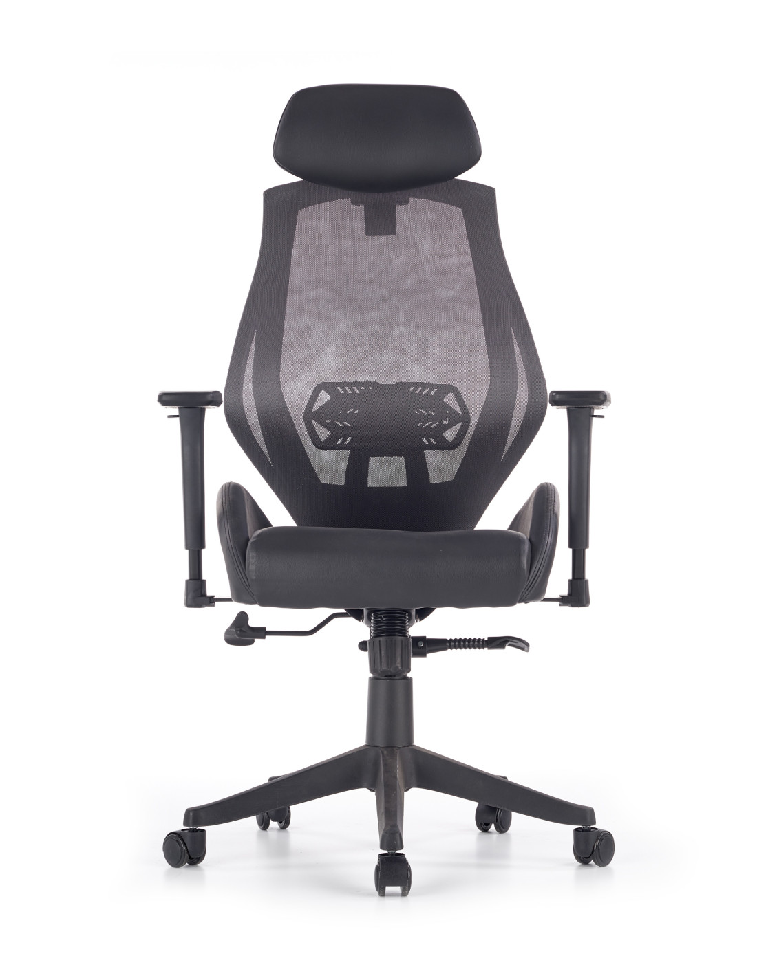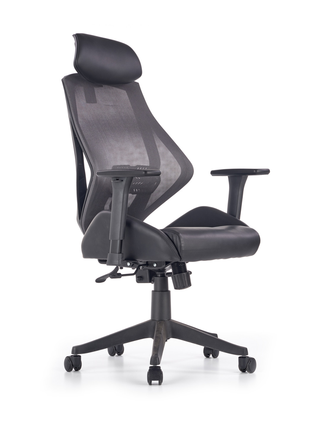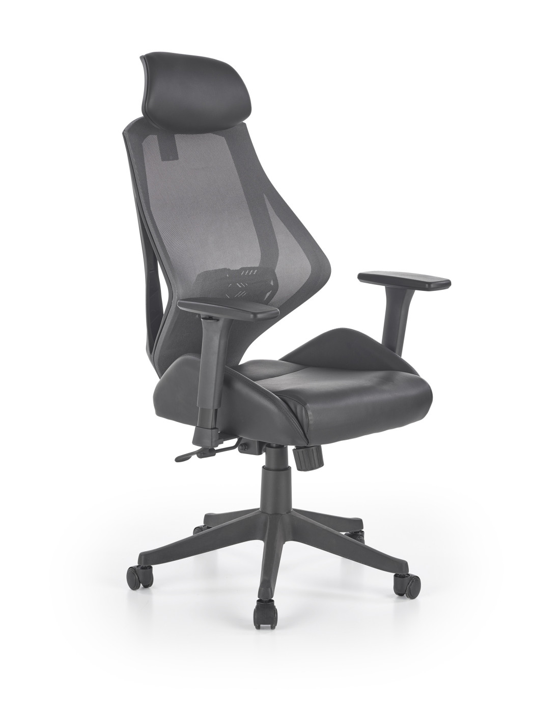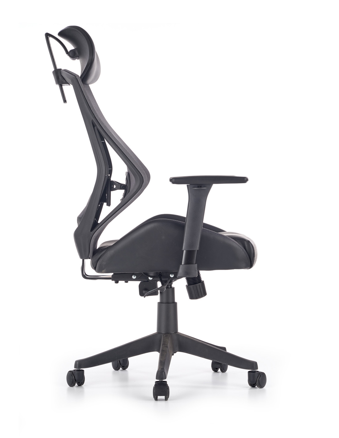 Fotel HASEL został wykonany z eco-skóry oraz siatki, co zapewnia mu elegancki wygląd i dobrą wentylację.