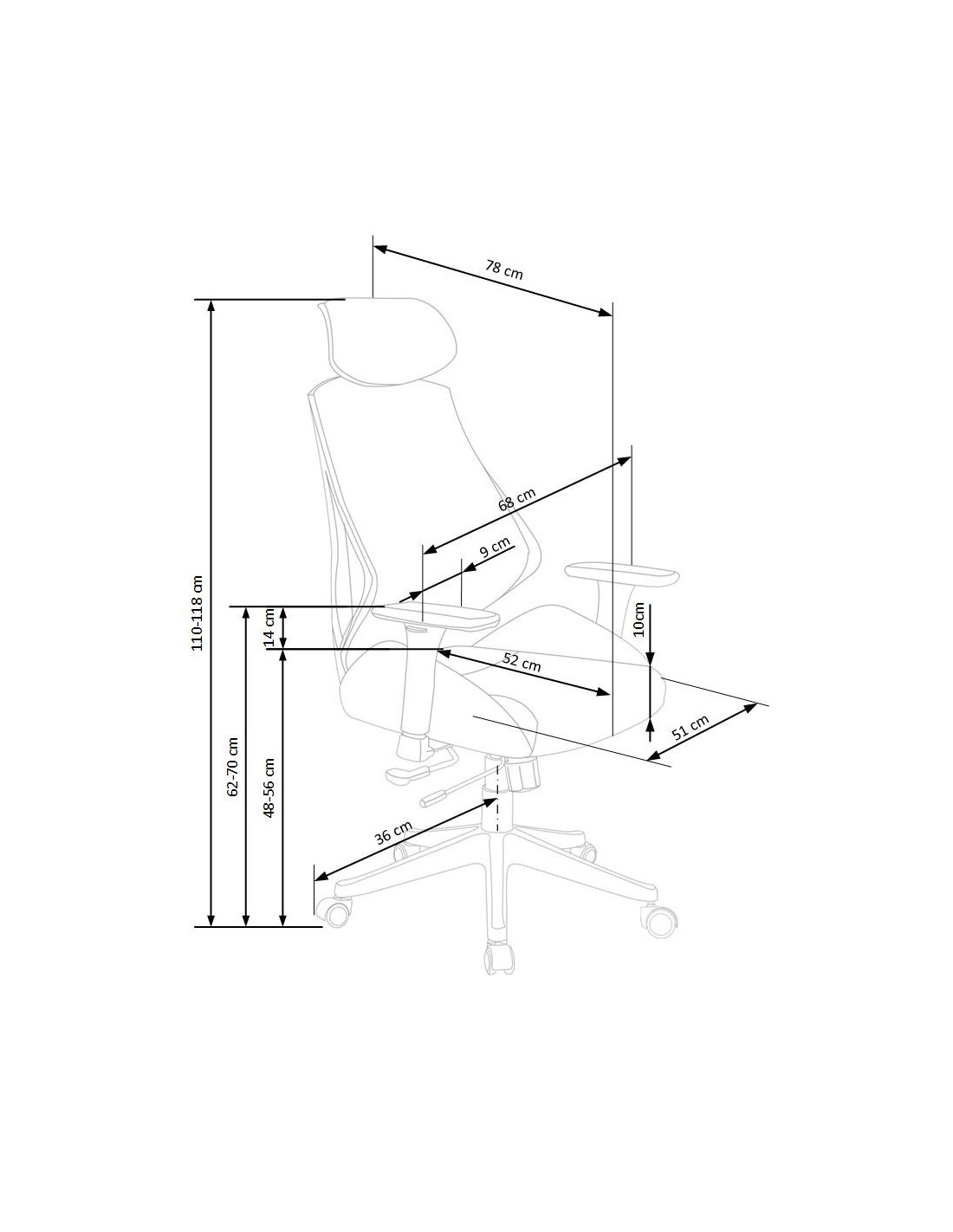 Szerokość wynosi 68 cm, głębokość 78 cm, a wysokość to 110-118 cm, z możliwością regulacji wysokości siedziska od 48 do 56 cm.