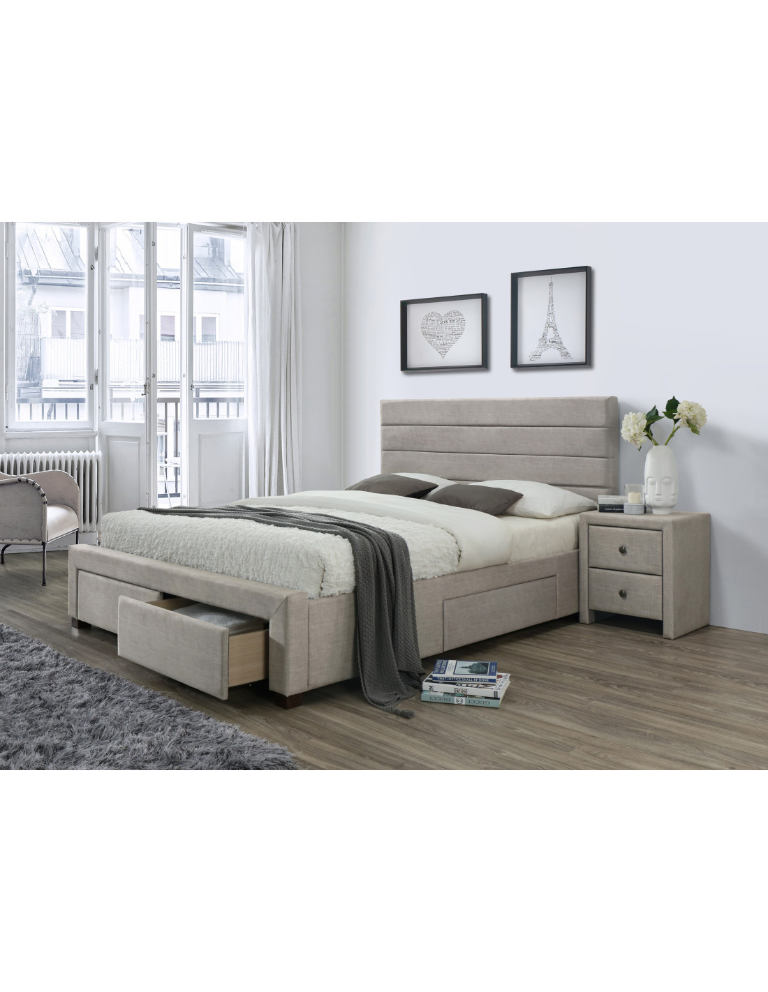Łóżko KAYLEON wykonane jest z tkaniny tapicerskiej w kolorze beżowym oraz drewna litego w odcieniu orzechowym.