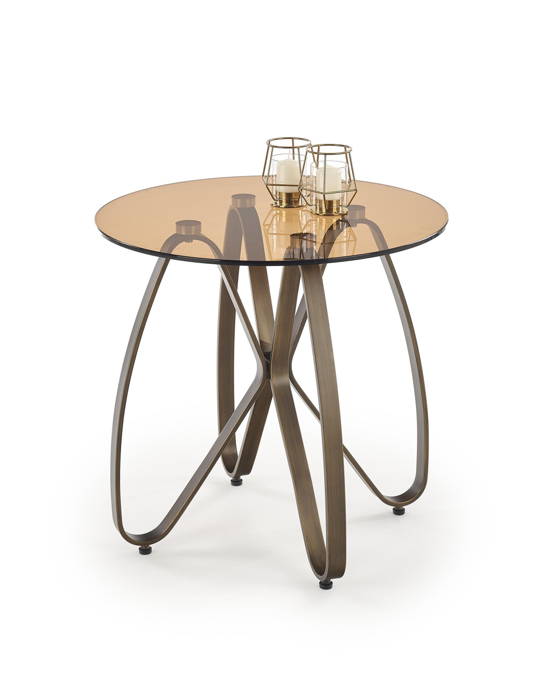 wymiary: fi55/54 cm,materiał: szklo / stal malowana,kolor: blat - brązowy,nogi - antyczny złoty
