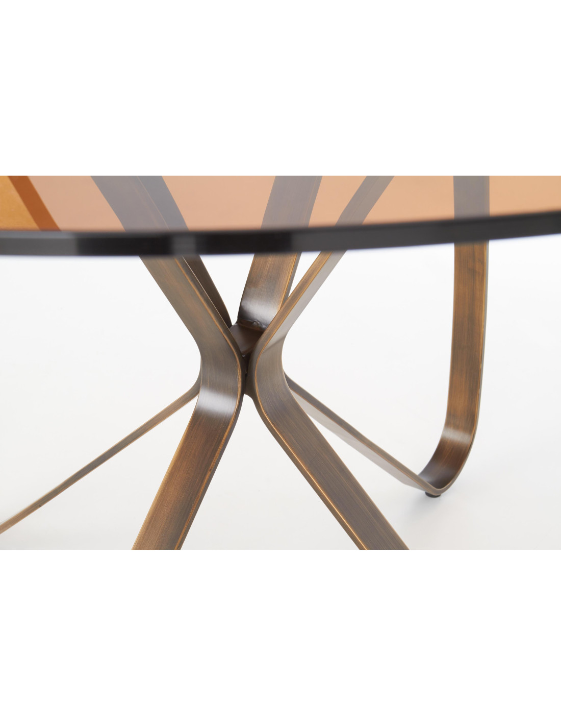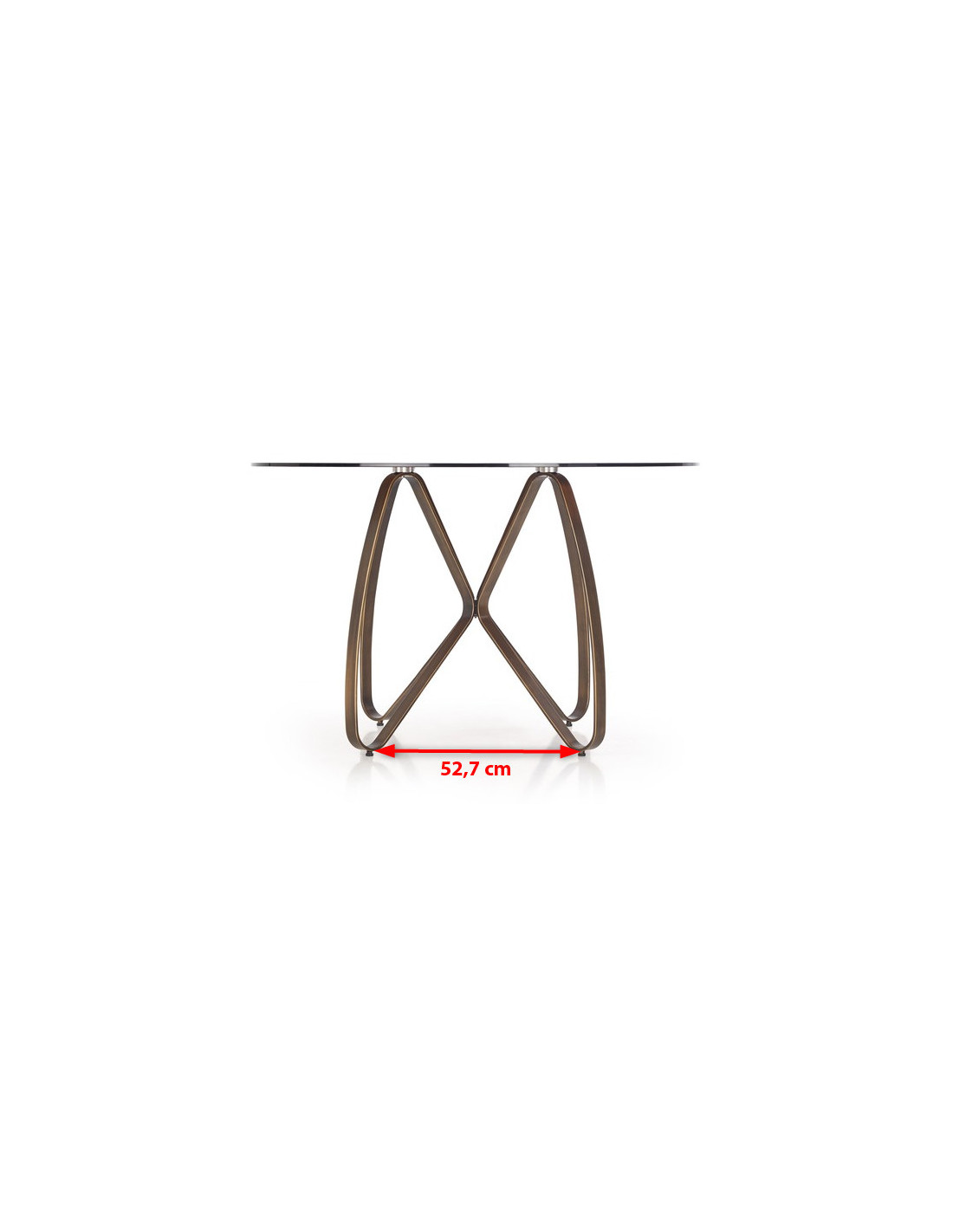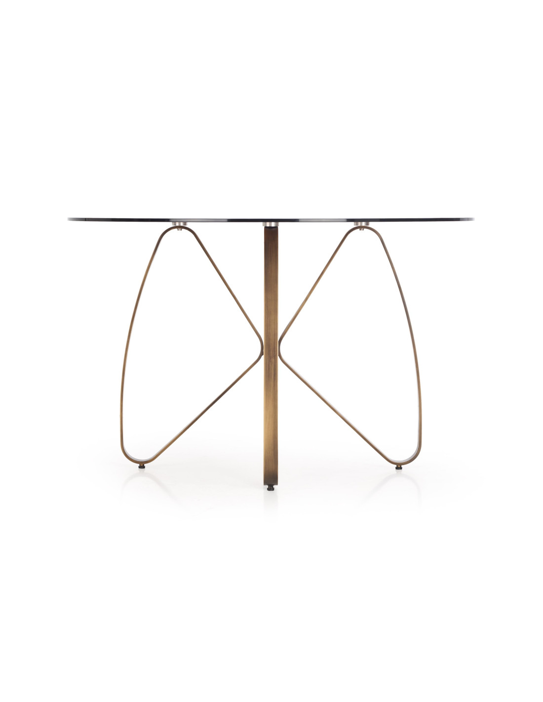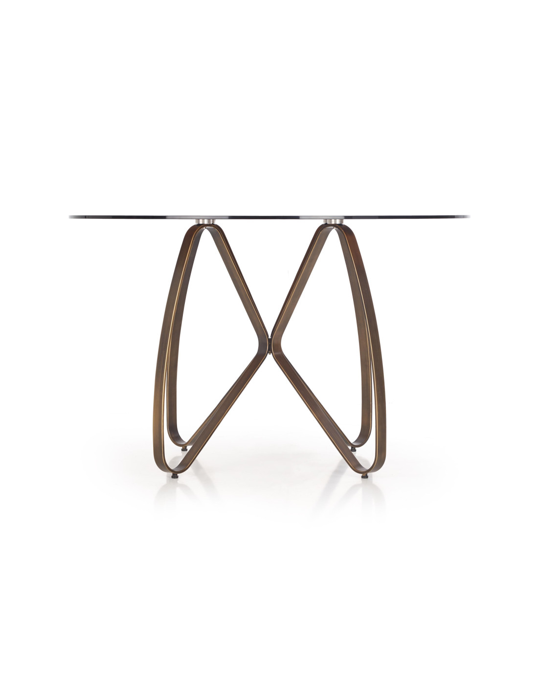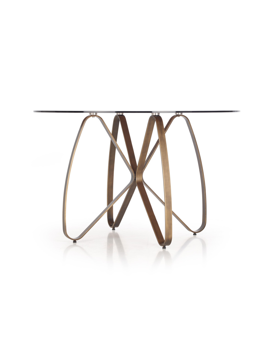 Stół LUNGO wykonany jest z przezroczystego szkła oraz stali malowanej w kolorze antycznego złota i brązu.