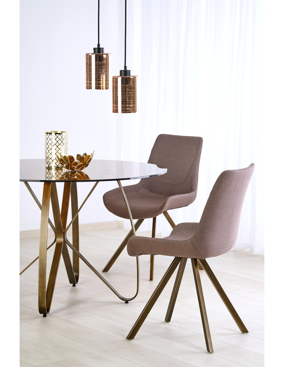 - ✅ Nowoczesny design: Okrągły stół z przezroczystym blatem i elegancką podstawą w kolorze antycznego złota i brązu.