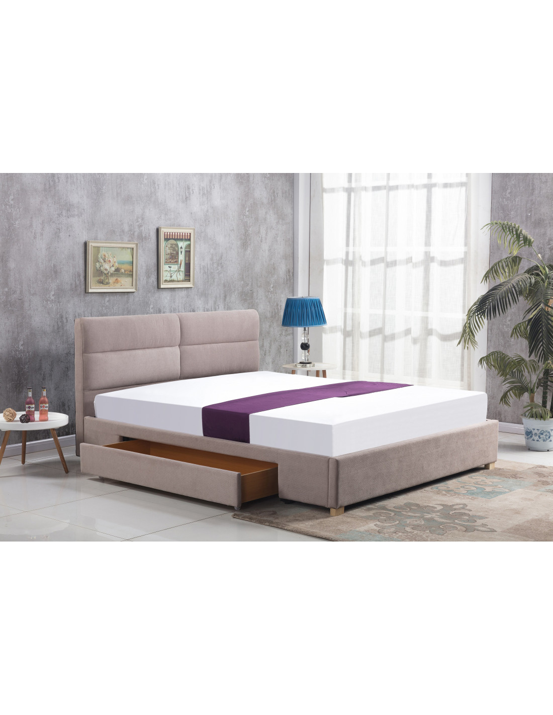 Prostokątny kształt oraz staranne wykończenie w kolorze beżowym z naturalnym drewnem to cechy, które czynią łóżko atrakcyjnym elementem wystroju. Oferując przestrzeń do spania 160x200 cm, łóżko MERIDA jest doskonałym wyborem dla par, które pragną komfortu i stylu.