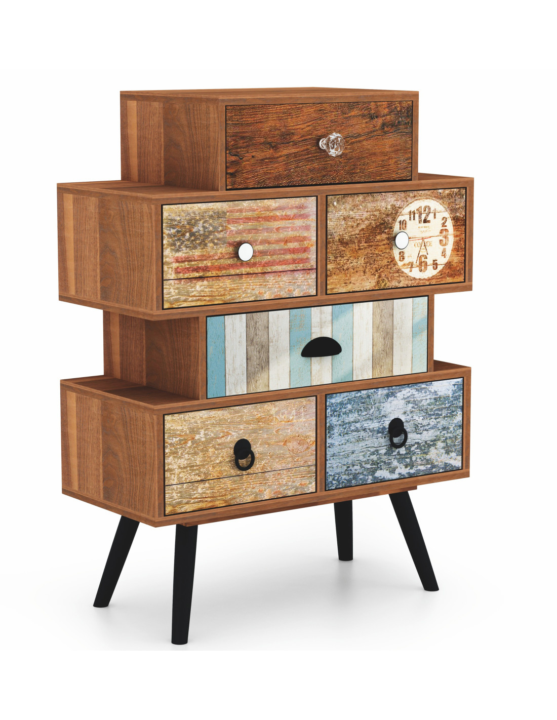 Każda szuflada jest inna – od imitacji drewna, przez stylizowane na stare deski, aż po wzory z zegarem i numerami. Różnorodność uchwytów, od gałek po uchwyty w kształcie półokręgu, sprawia, że każdy element komody jest unikalny. To mebel, który nie tylko spełnia funkcję praktyczną, ale również staje się wyrazistym akcentem dekoracyjnym w każdym pomieszczeniu.