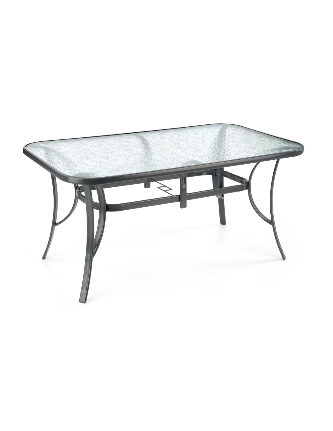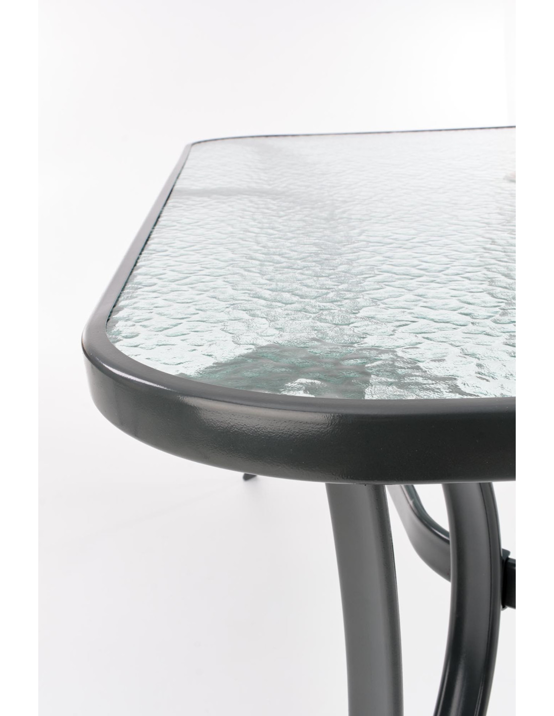 Zaprojektowany z myślą o Tobie szklany stół ogrodowy MOSLER to połączenie nowoczesnego designu i funkcjonalności. Jego prostokątny blat wykonany z przezroczystego, teksturowanego szkła w kolorze ciemnego popielu osadzony jest na eleganckiej metalowej ramie. Delikatnie wygięte nogi dodają lekkości, co sprawia, że stół idealnie wpisuje się w minimalistyczny styl ogrodowych aranżacji.