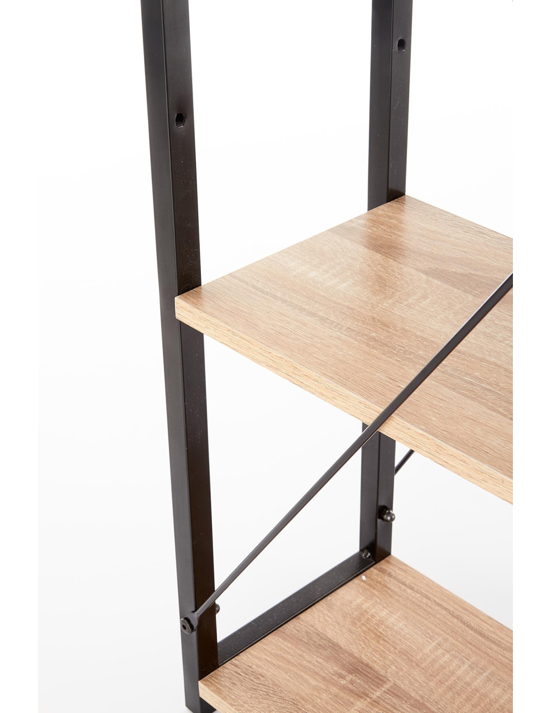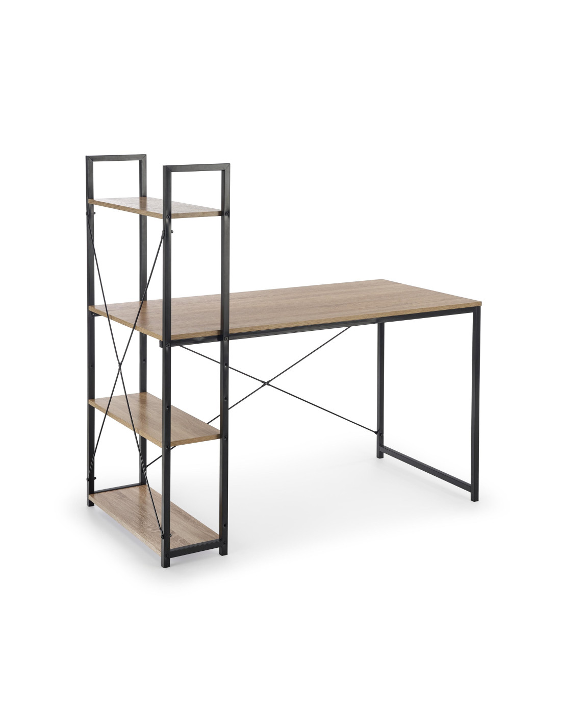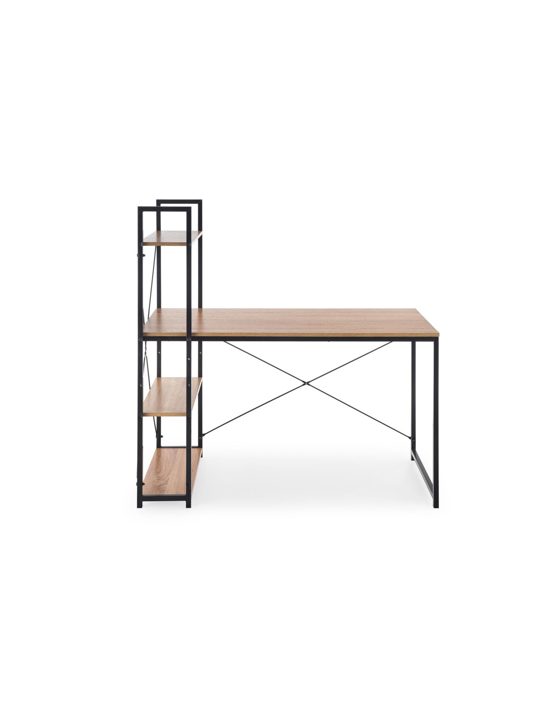 Biurko zostało zaprojektowane z myślą o praktyczności. Wyposażone w trzy otwarte półki z lewej strony, idealnie nadaje się do przechowywania książek, dokumentów czy dekoracji. Dodatkowo, krzyżowe wzmocnienia nóg zapewniają stabilność konstrukcji, co czyni je wygodnym miejscem do pracy i kreatywności.