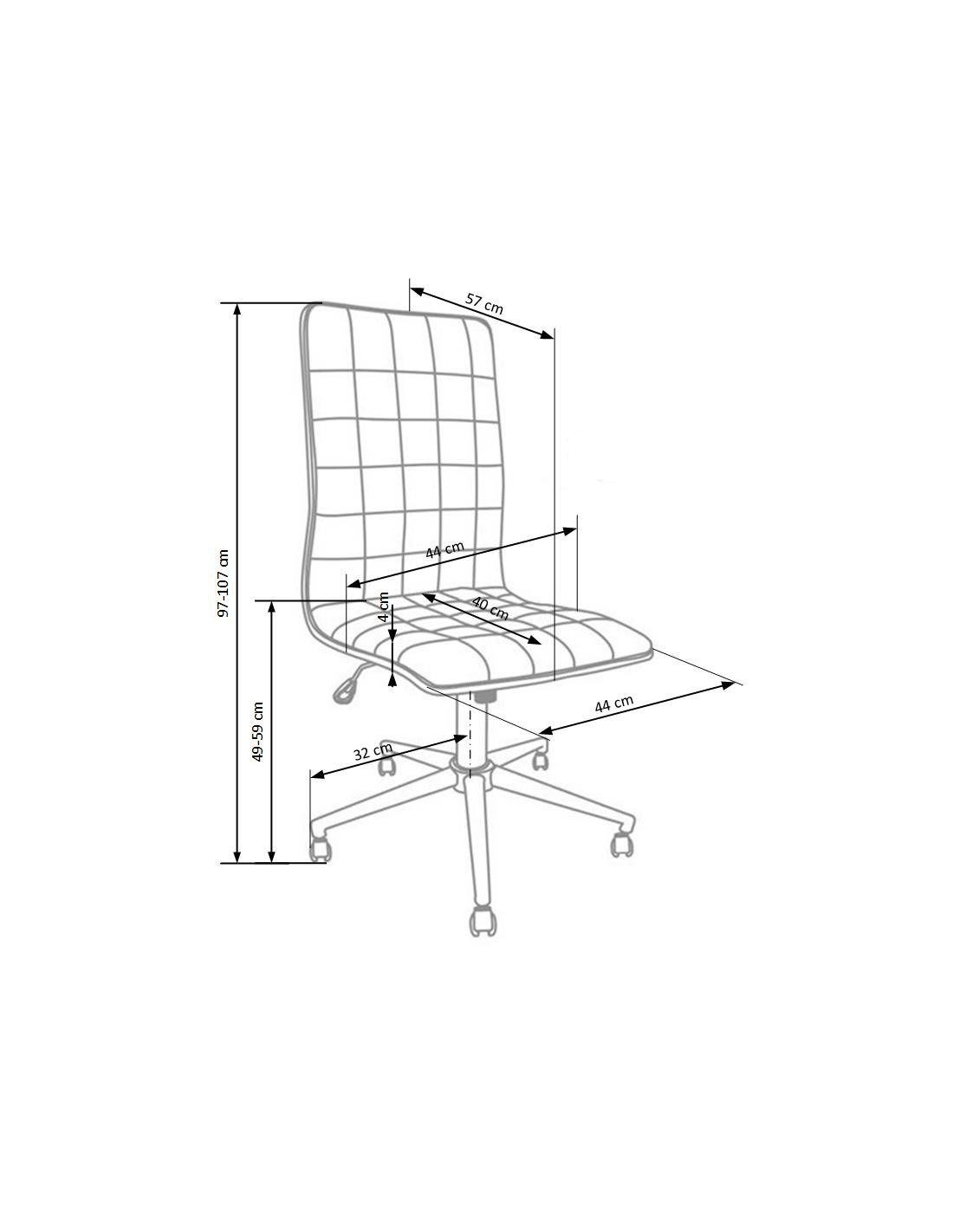 Fotel ma szerokość 44 cm, głębokość 46 cm i wysokość regulowaną w zakresie od 97 do 107 cm.