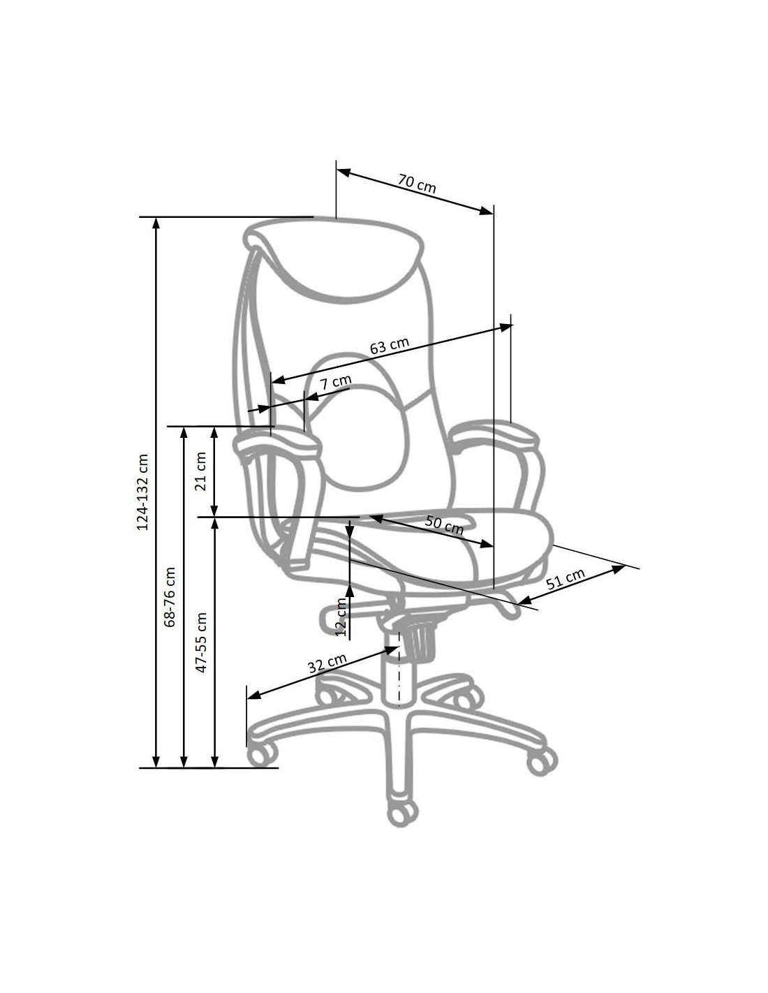 Szerokość wynosi 63 cm, głębokość to 70 cm, a wysokość to 124-132 cm, z regulacją wysokości siedziska od 47 do 55 cm.