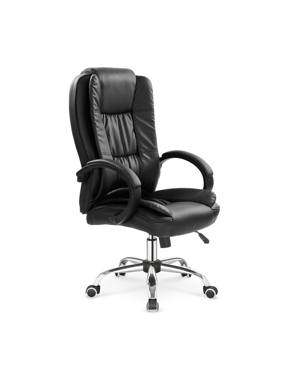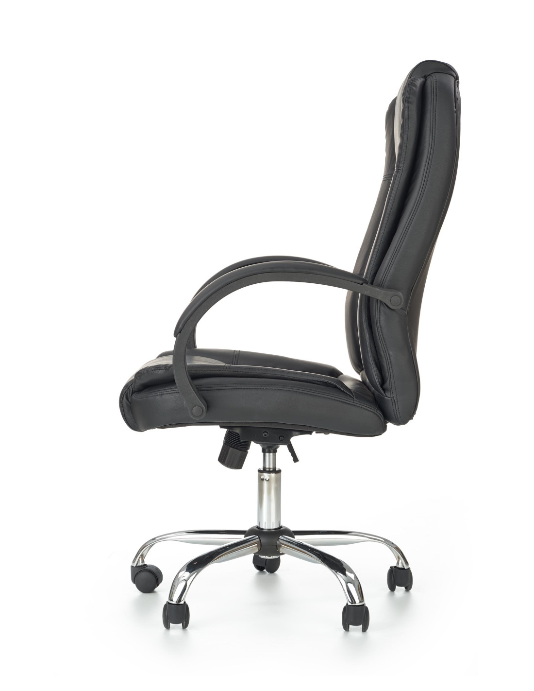 Fotel posiada ergonomiczny kształt, regulowany zagłówek, mechanizm TILT oraz chromowaną podstawę z pięcioma kółkami.