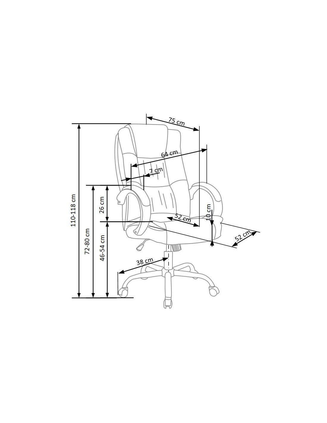 Szerokość wynosi 64 cm, głębokość 75 cm, a wysokość to 110-118 cm, z możliwością regulacji wysokości siedziska od 46 do 54 cm.
