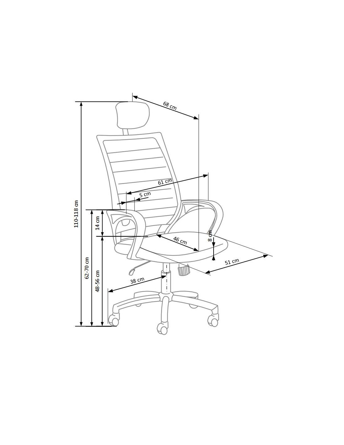 Szerokość wynosi 61 cm, głębokość 68 cm, a wysokość to 110-118 cm, z możliwością regulacji wysokości siedziska od 48 do 56 cm.