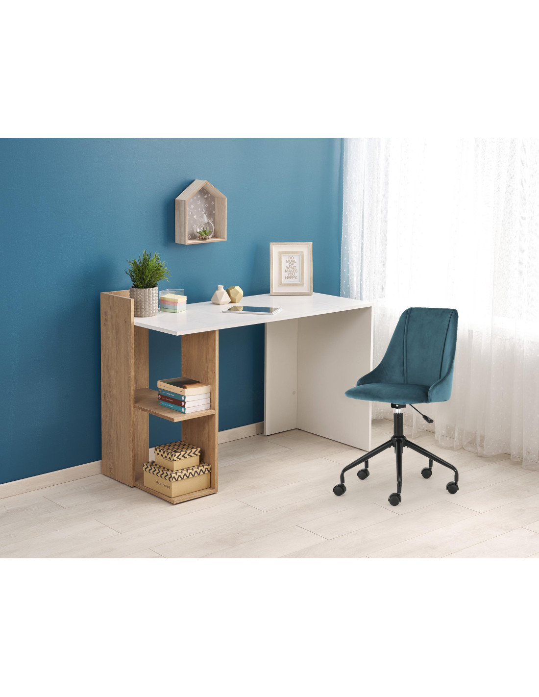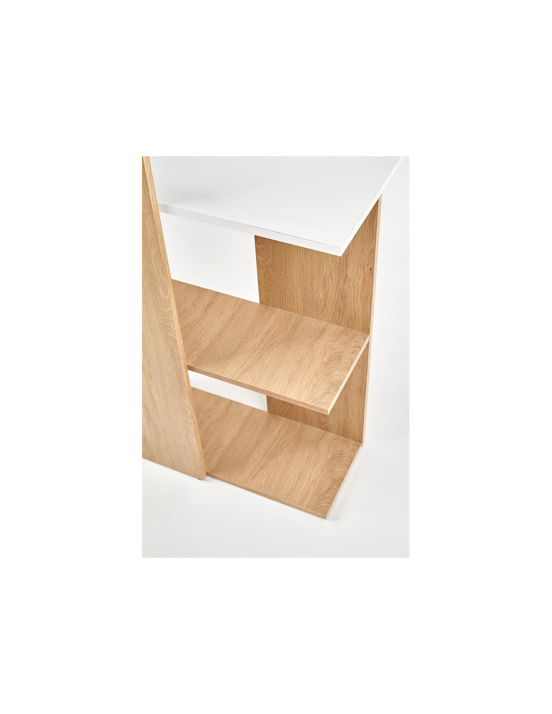 Biurko zostało wyposażone w dwie otwarte półki, które umożliwiają łatwy dostęp do książek, dokumentów czy dekoracji. Dodatkowo, jego elegancka konstrukcja sprawia, że jest to miejsce, w którym praca staje się przyjemnością. Idealne do nauki, pracy zdalnej czy jako stylowy element wystroju.