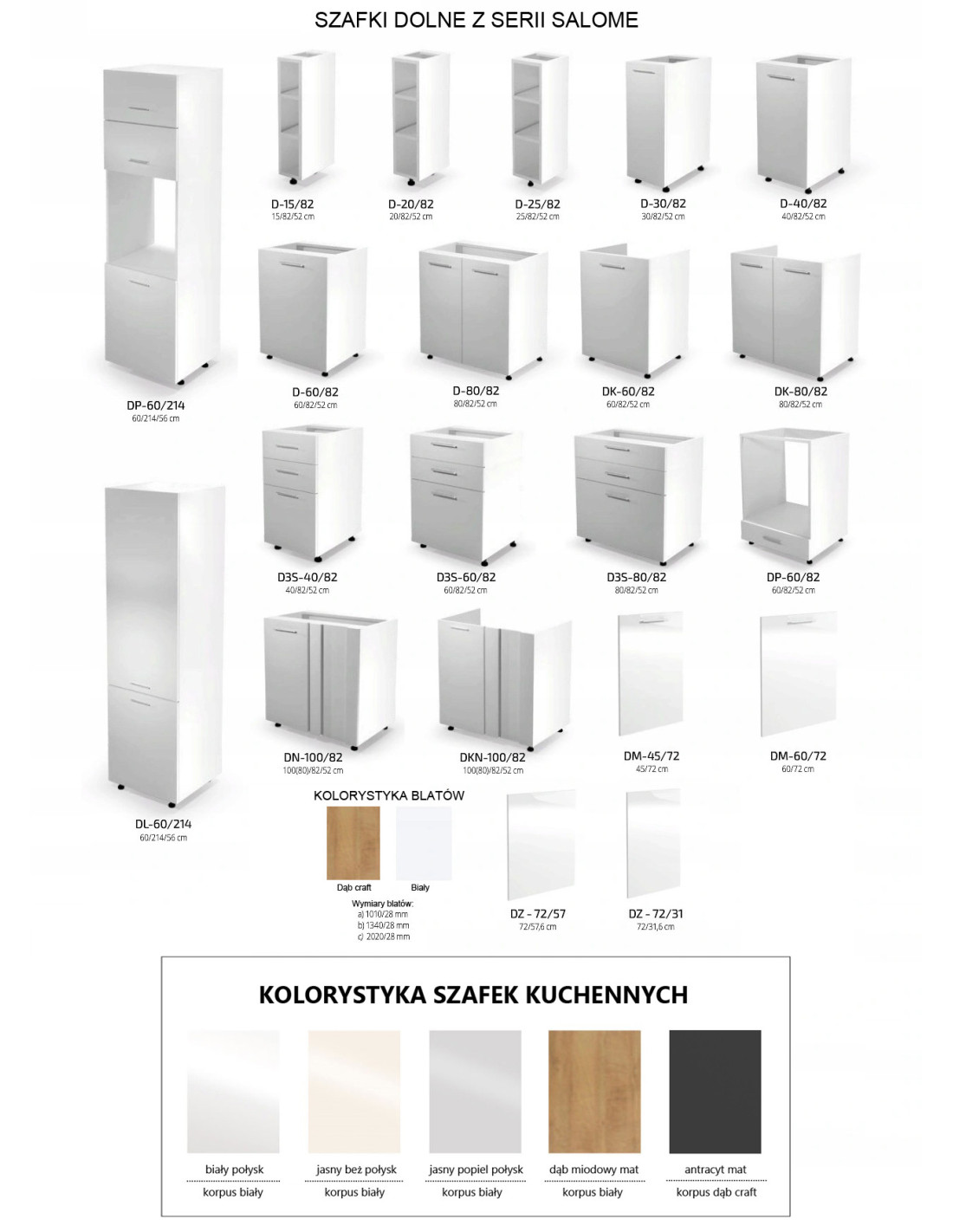 Oferta obejmuje wiele typów modułowych szafek kuchennych (górnych, dolnych, zlewozmywakowych, pod piekarnik itp.) w różnych rozmiarach. Możesz je swobodnie łączyć, uzyskując własny, unikalny układ mebli kuchennych.