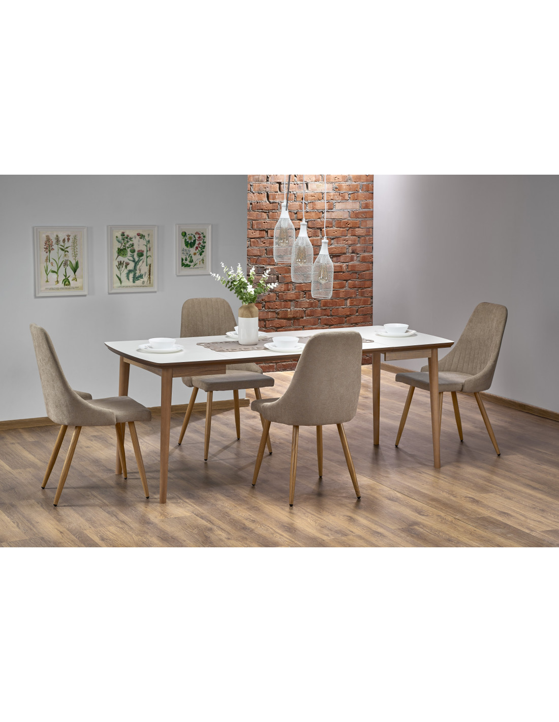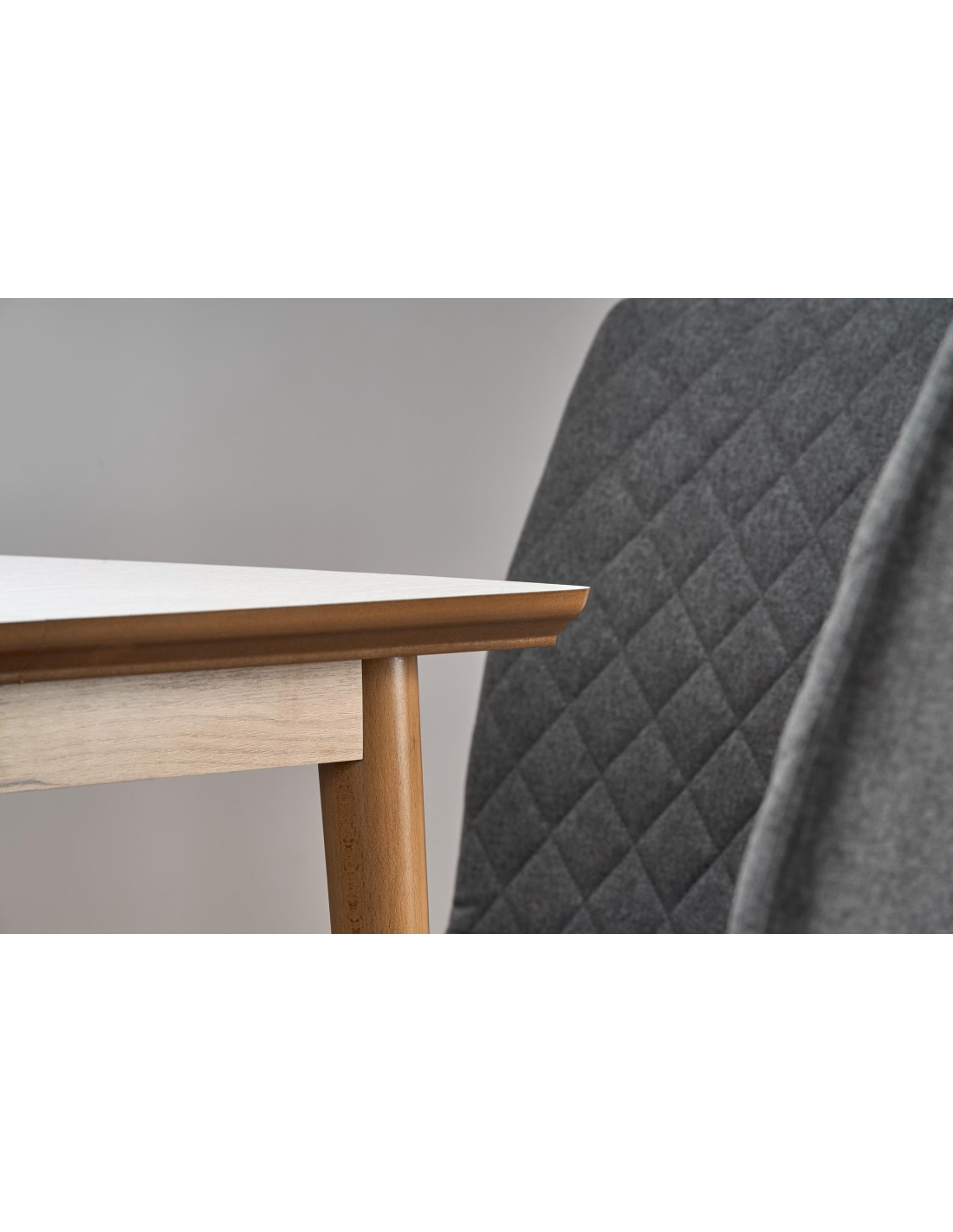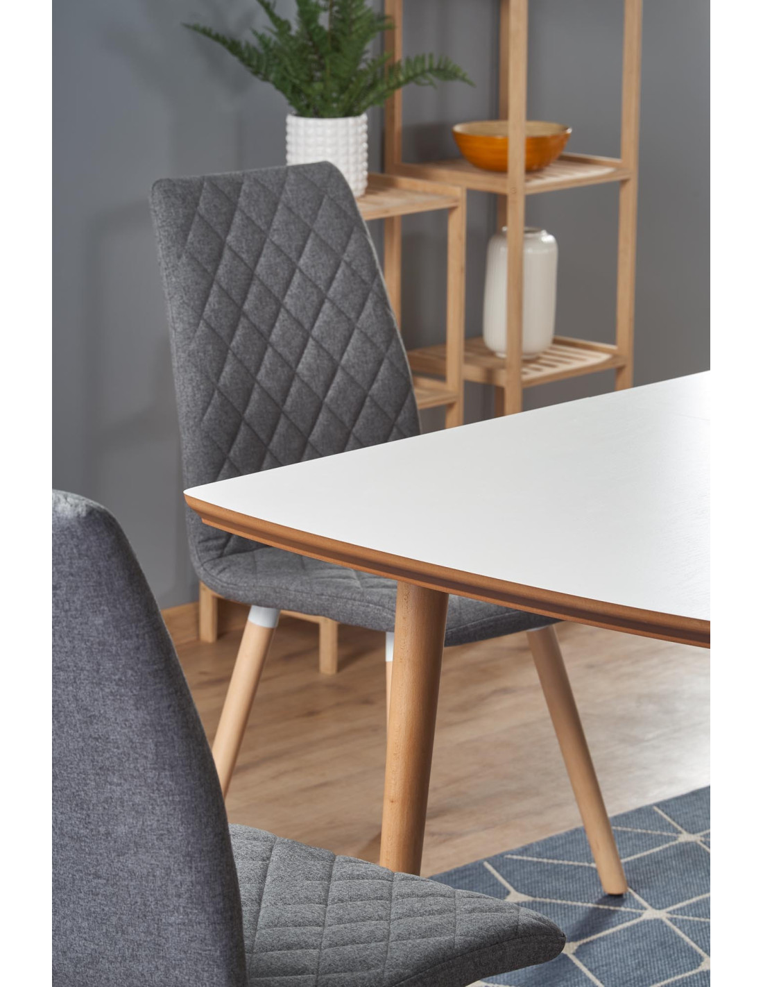 Stół BARRET dostępny jest w eleganckim białym kolorze blatu oraz ciepłym kolorze dębu Lefkas nóg, co czyni go wszechstronnym meblem.