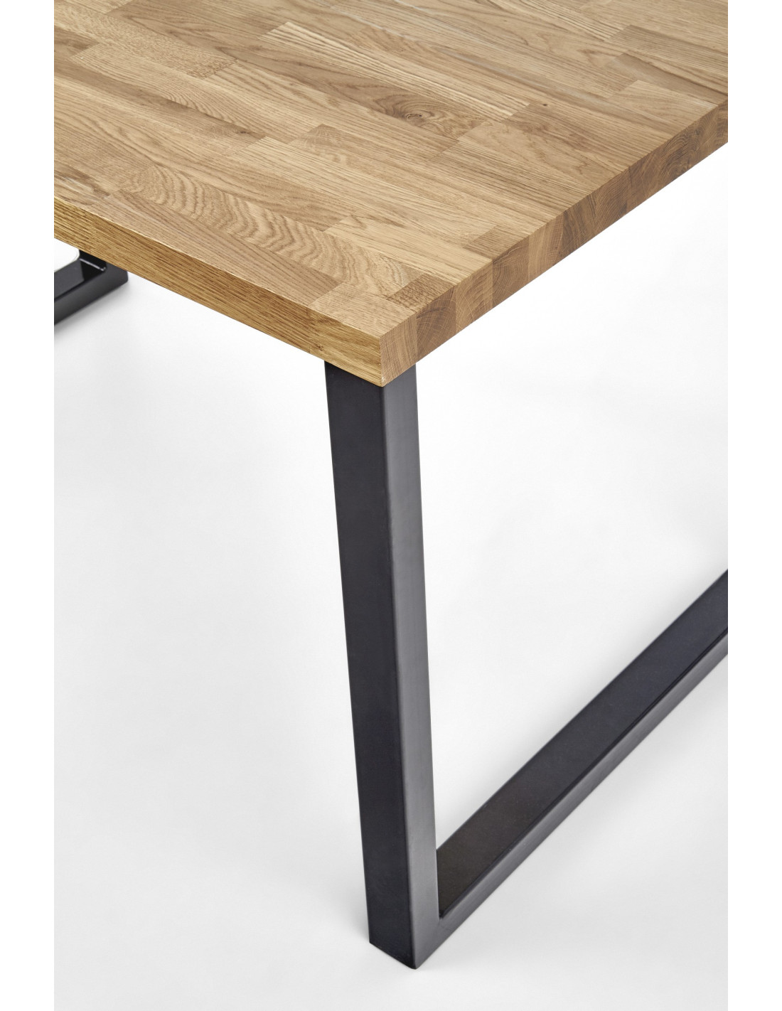 Blat stołu ma naturalny odcień dębu, natomiast nogi są malowane na czarno, co tworzy atrakcyjny kontrast.