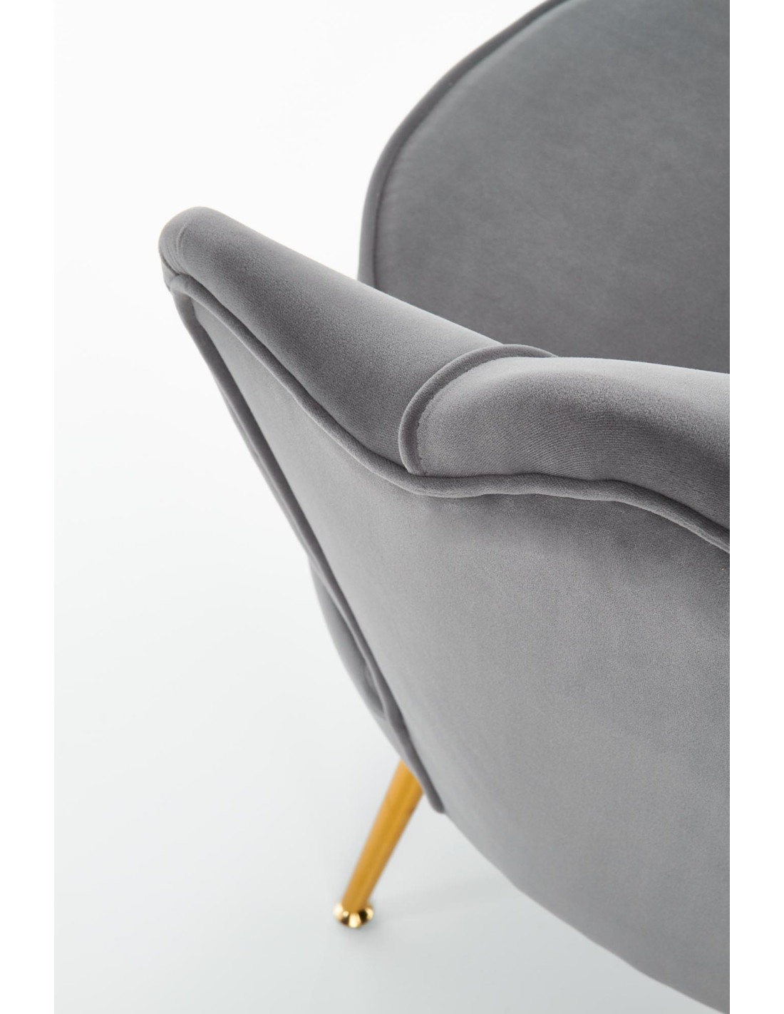 Ciesz się nowym fotelem wypoczynkowym AMORINITO, który wprowadza do Twojego wnętrza elegancję i luksus. Jego zaokrąglone, muszlowe oparcie oraz smukłe, złote nogi tworzą harmonijną całość, która z pewnością przyciągnie wzrok. Aksamitne wykończenie w kolorze popielatym dodaje mu wyjątkowego charakteru, a głębokie siedzisko sprawia, że każda chwila spędzona w tym fotelu to prawdziwa przyjemność.