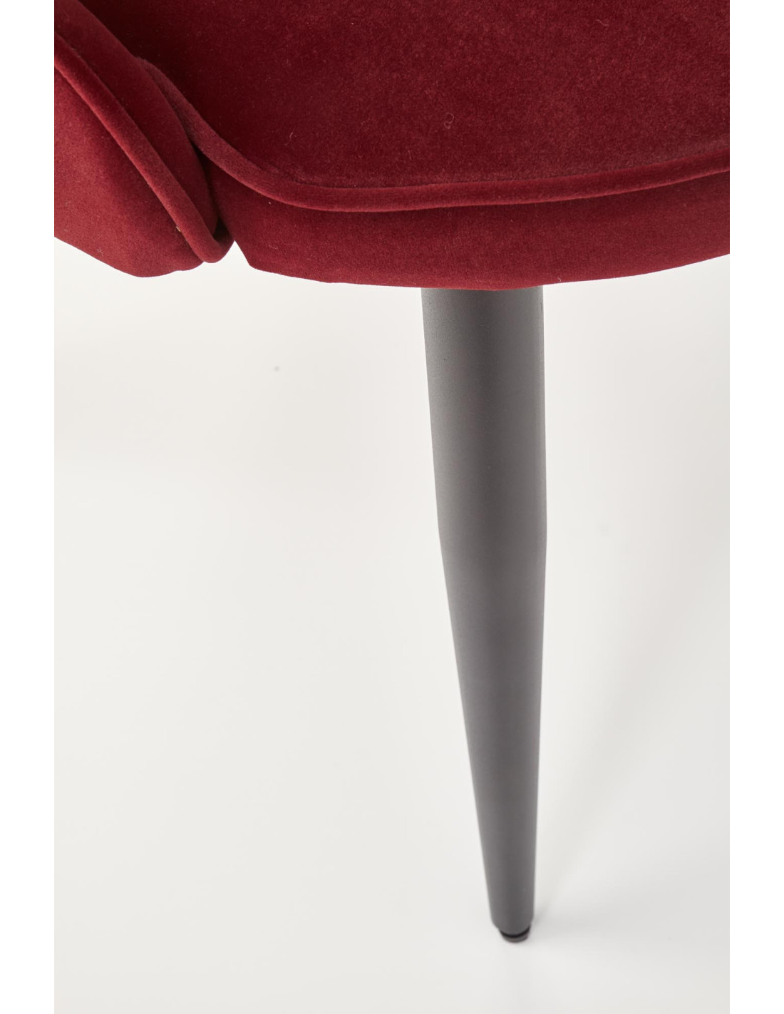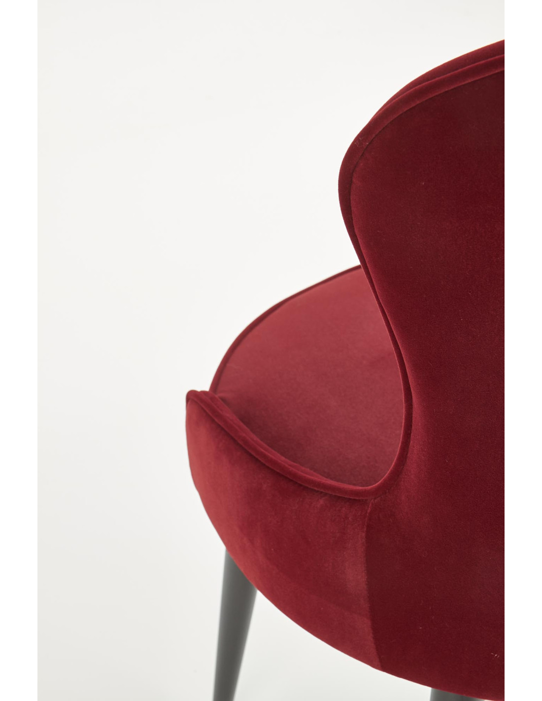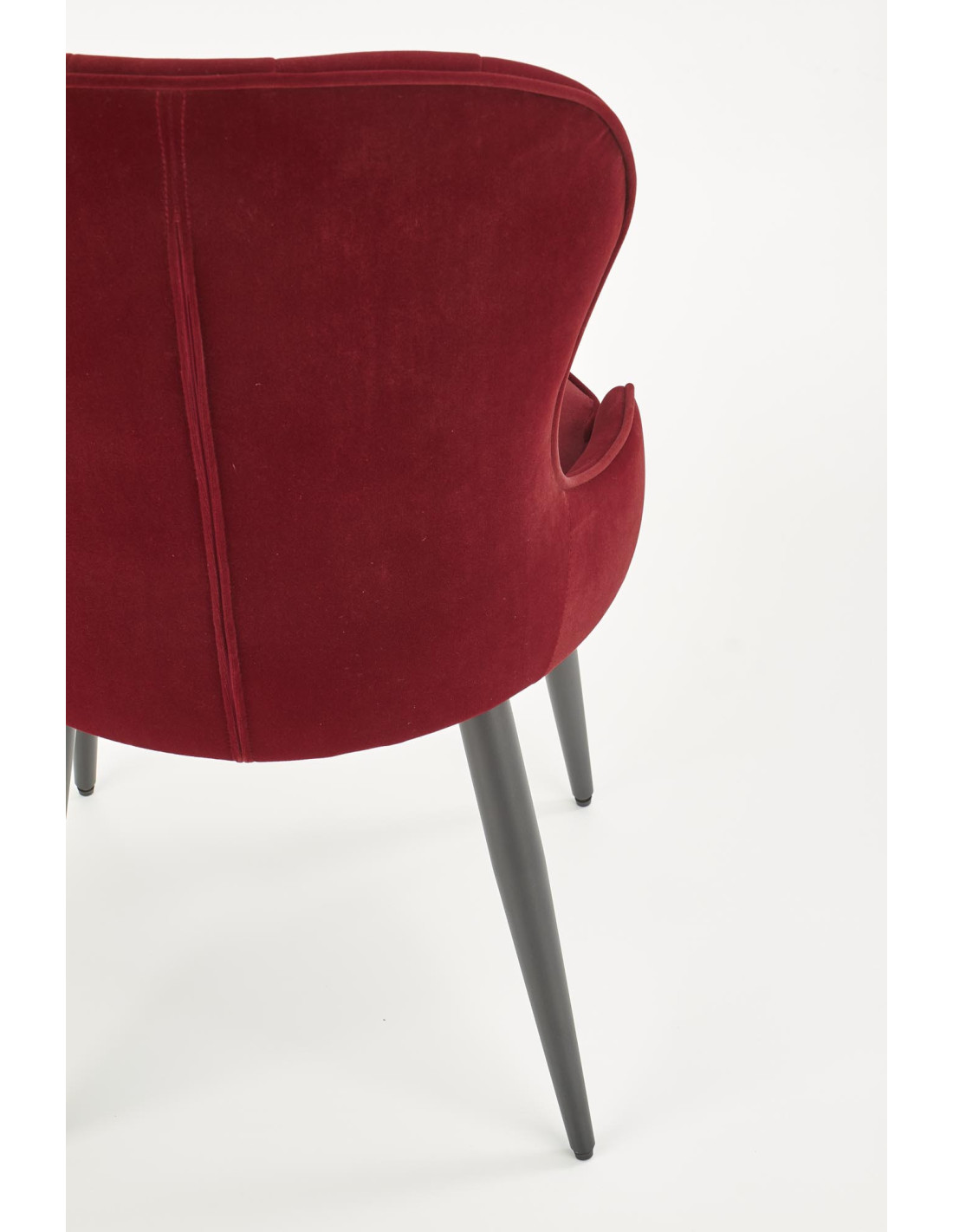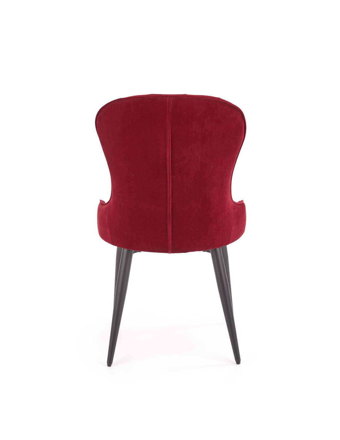 Krzesło K366 wyróżnia się zaokrąglonym oparciem z dekoracyjnymi przeszyciami oraz eleganckim, bordowym kolorem, a także smukłymi, czarnymi nogami.