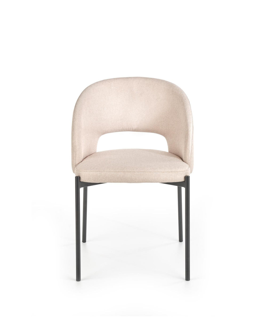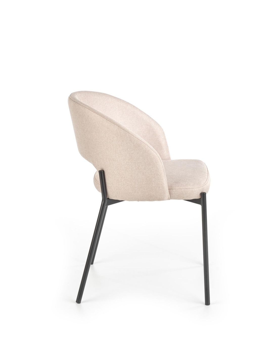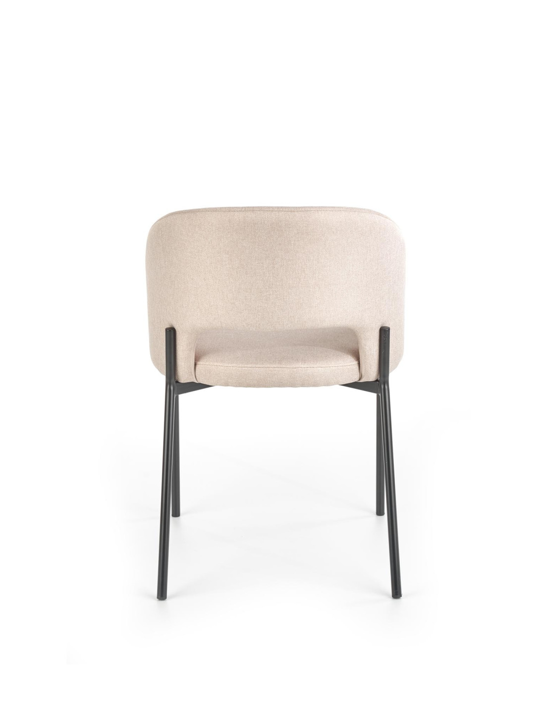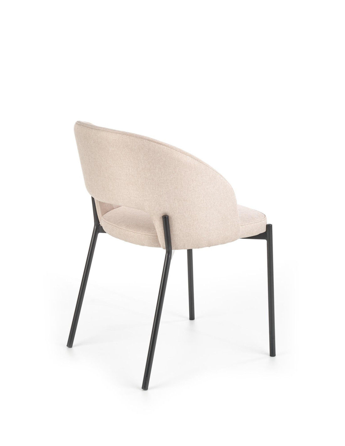Krzesło wyróżnia się zaokrąglonym oparciem, metalowymi nogami oraz minimalistycznym designem w beżowym kolorze.