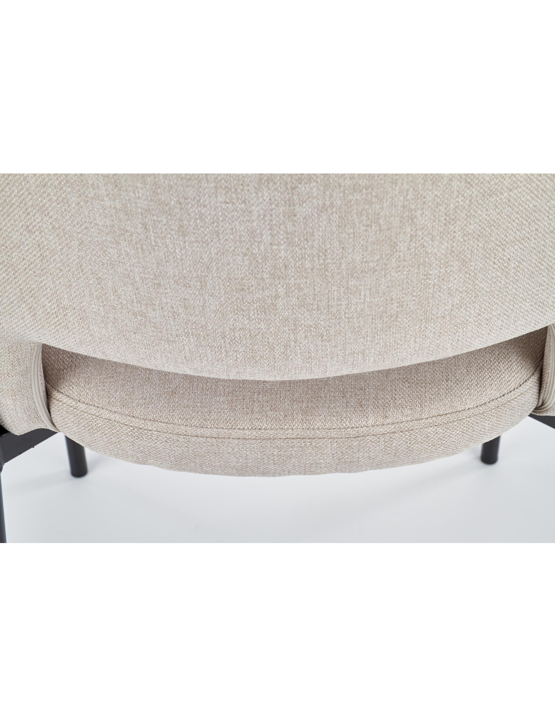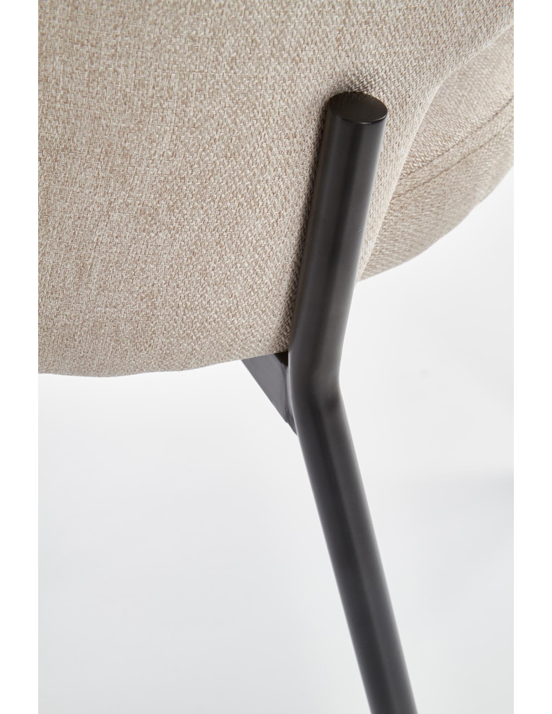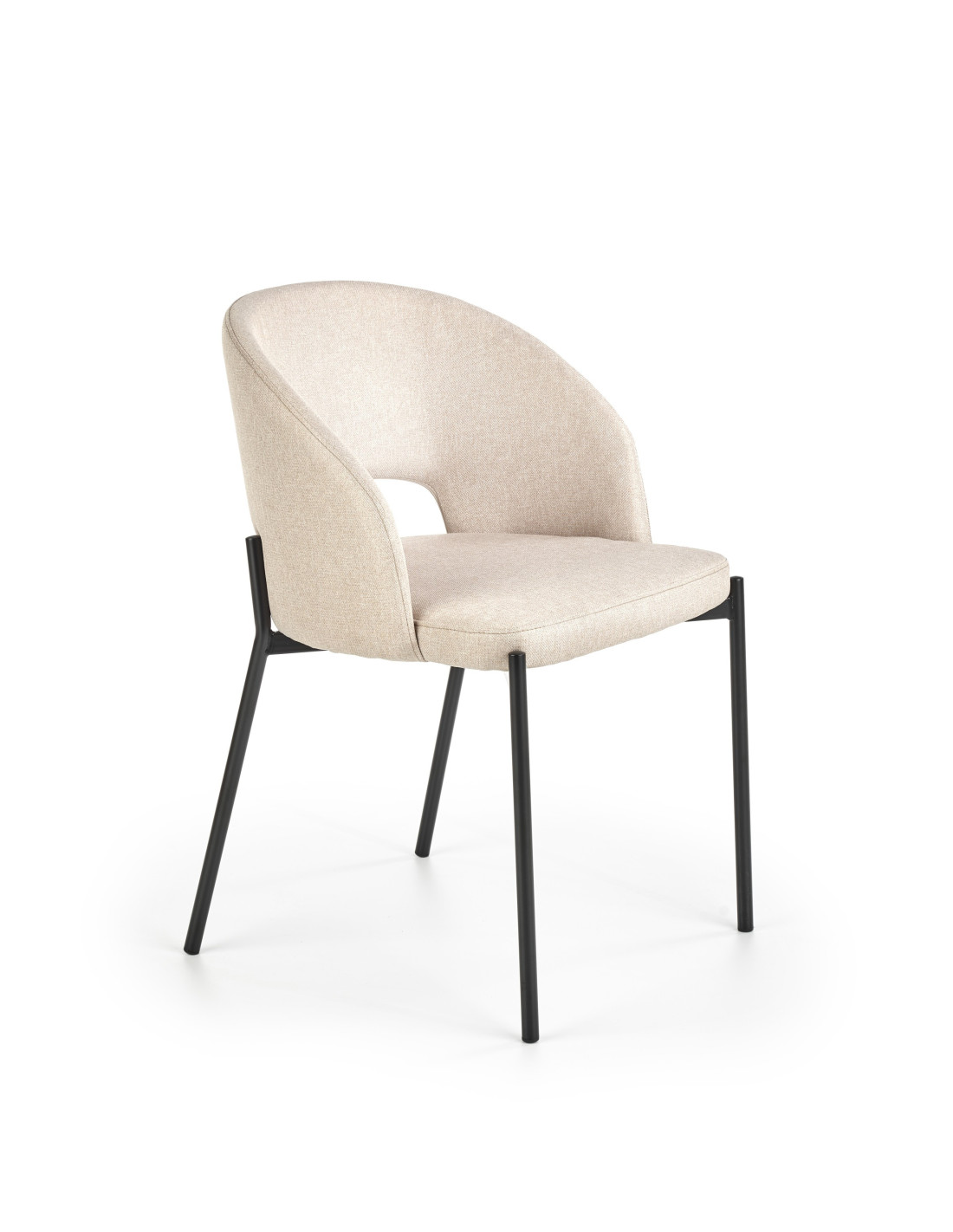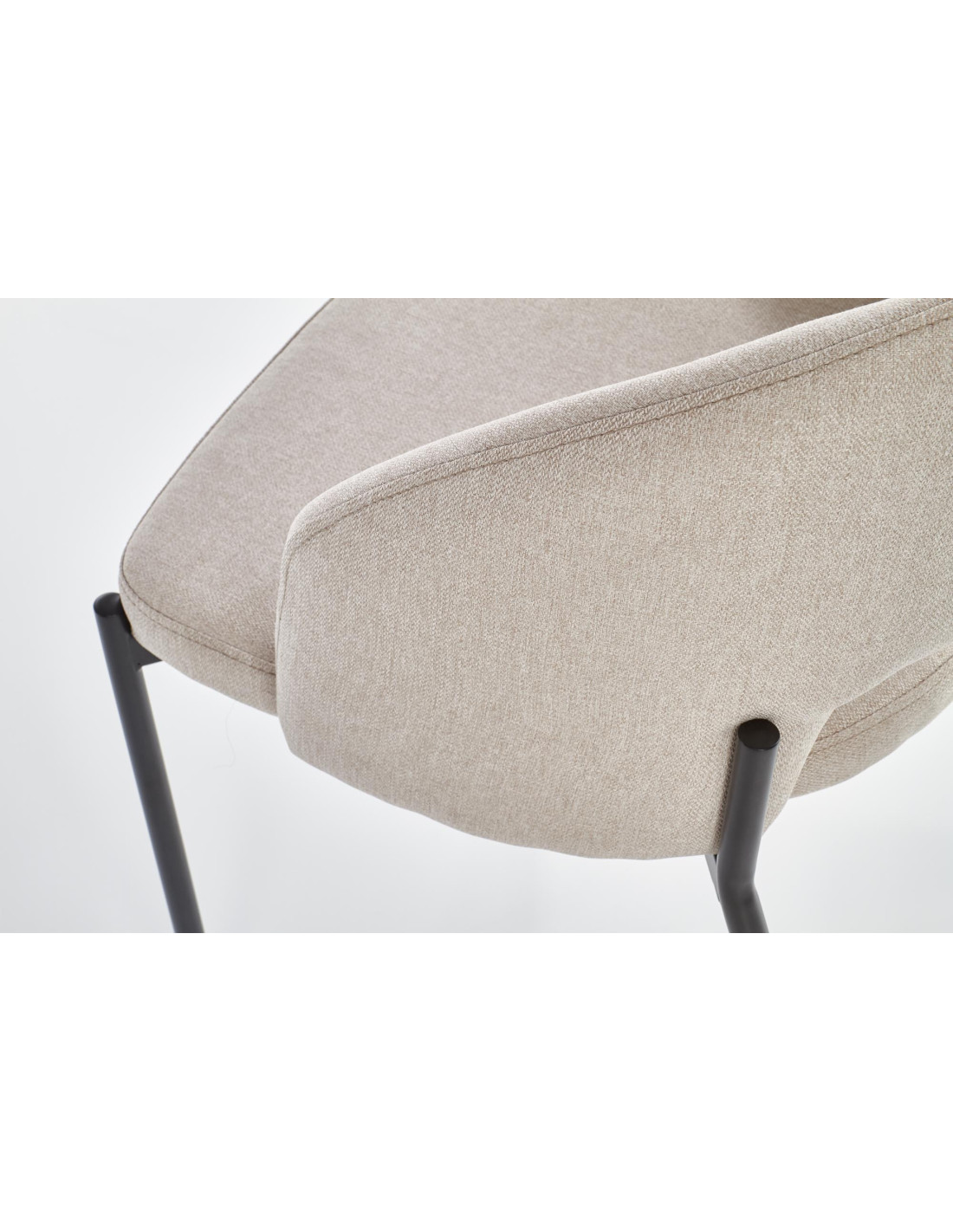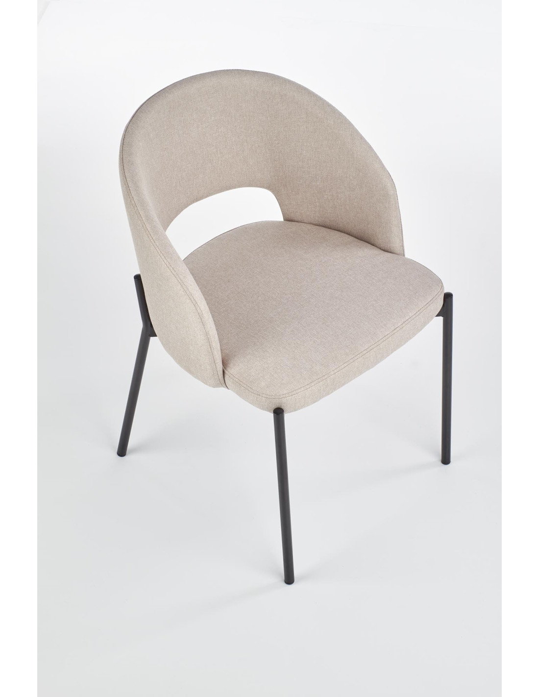 Krzesło wyróżnia się zaokrąglonym oparciem, metalowymi nogami oraz minimalistycznym designem w beżowym kolorze.