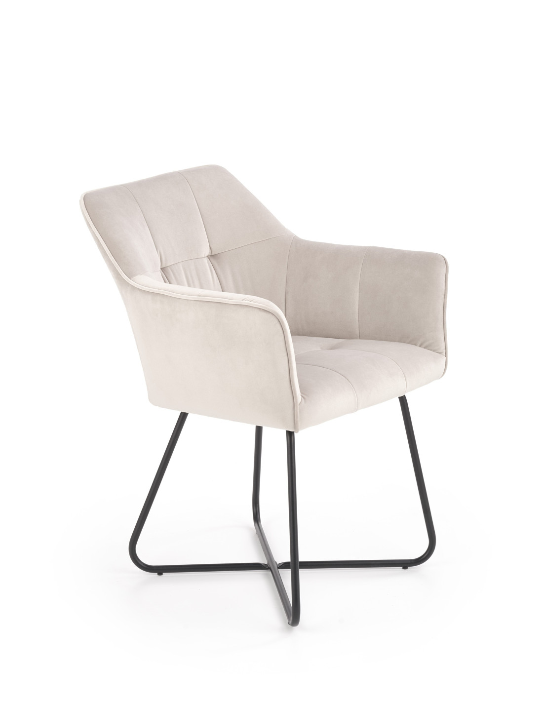 Krzesło K377 wyróżnia się prostokątnymi, metalowymi nogami w kolorze czarnym, co nadaje mu nowoczesny wygląd. Styl wnętrzarski, do którego pasuje, to nowoczesny z nutą elegancji, co czyni go doskonałym dodatkiem do każdego eleganckiego wnętrza.