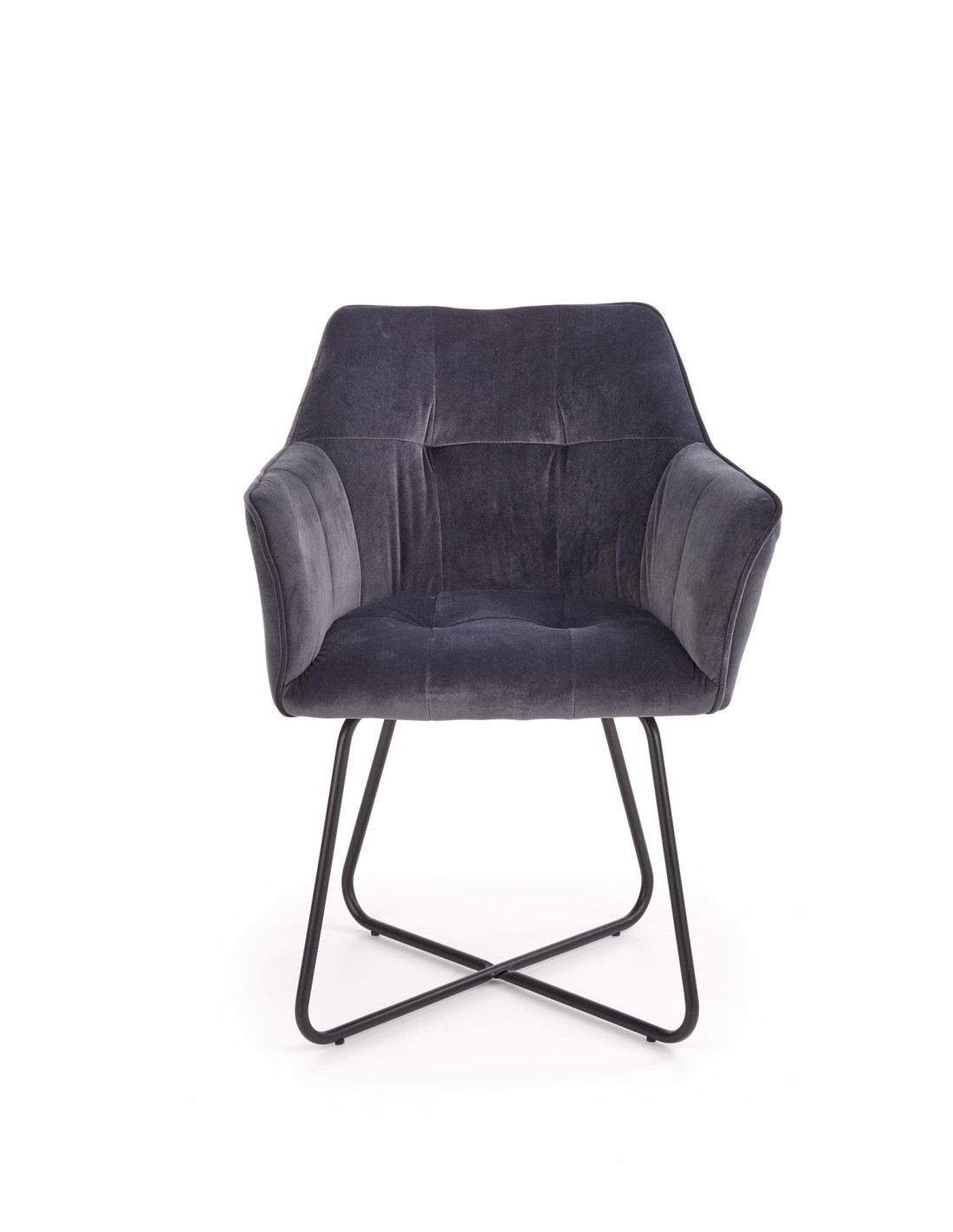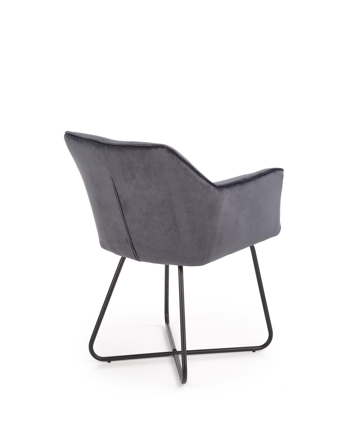 Krzesło wykonane jest z tkaniny velvet oraz stali malowanej proszkowo, co zapewnia mu elegancki wygląd.