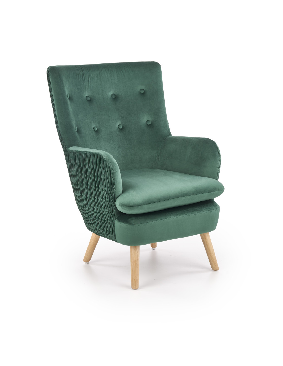 Poznaj fotel wypoczynkowy RAVEL, który łączy elegancję z komfortem użytkowania. Wykonany z wysokiej jakości materiału velvet, w głębokim zielonym kolorze, ten fotel to doskonały wybór dla każdego, kto pragnie dodać do swojego wnętrza odrobinę luksusu. Z pikowanym oparciem z guzikami oraz gładkim siedziskiem, fotel emanuje klasycznym stylem retro, który wprowadzi harmonię do Twojego domu.
