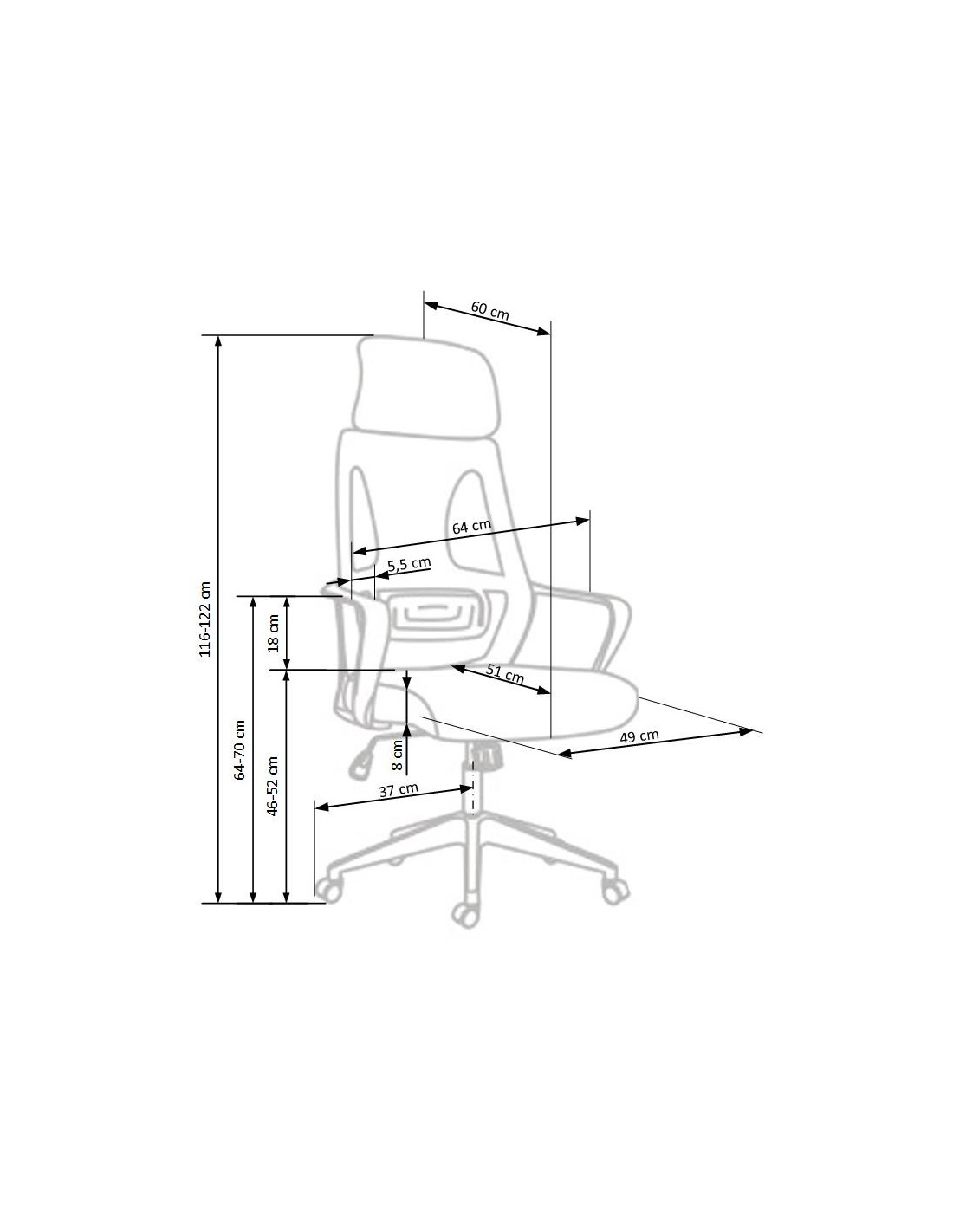 Szerokość wynosi 64 cm, głębokość 60 cm, a wysokość to 116-122 cm z możliwością regulacji wysokości siedziska od 46 do 52 cm.