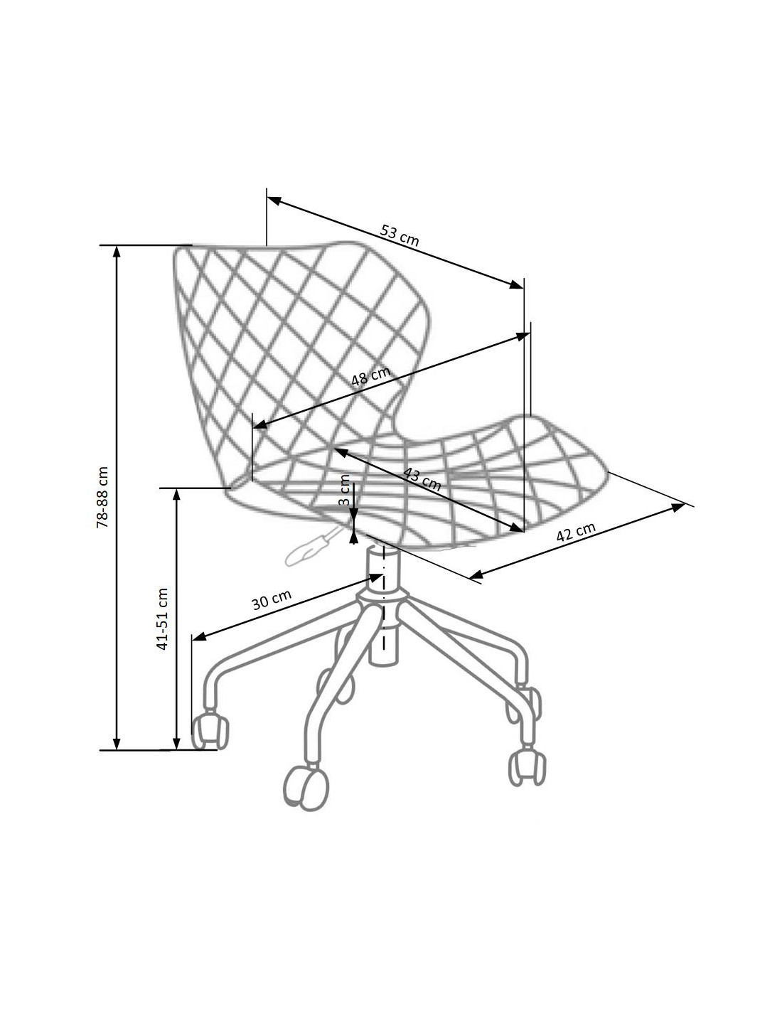 Szerokość wynosi 48 cm, głębokość 57 cm, a wysokość to 79-88 cm, z możliwością regulacji wysokości siedziska od 46 do 55 cm.