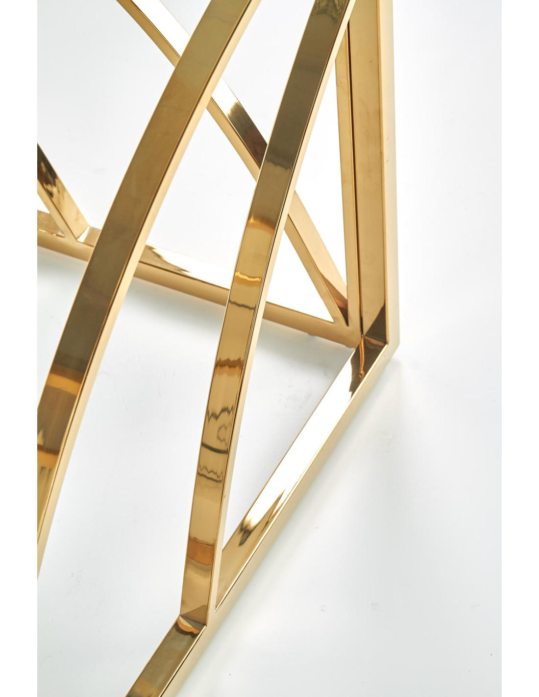 Ława UNIVERSE wykonana jest z dymionego szkła oraz stali nierdzewnej w kolorze złotym.