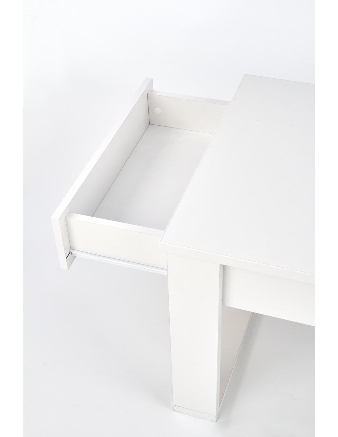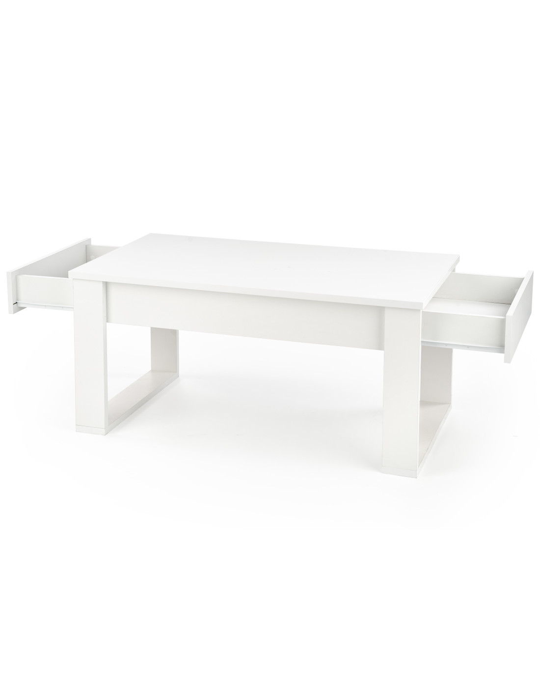 Ława NEA wyróżnia się minimalistycznym designem, białym kolorem oraz dwiema wysuwanymi szufladami, co czyni ją praktycznym meblem do każdego salonu.