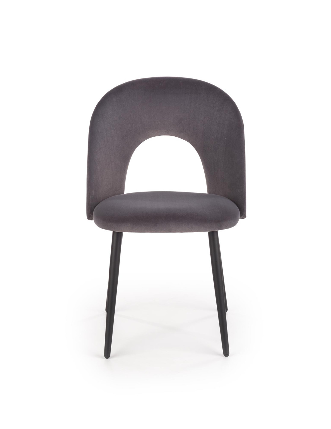 Krzesło K384 to doskonały wybór dla tych, którzy pragną połączyć styl z funkcjonalnością. Podkreśl elegancję swojego wnętrza dzięki krzesłu tapicerowanemu w popielatym welurze, które zachwyca nowoczesnym designem i ergonomicznością. Jego zaokrąglone oparcie z otworem w dolnej części nadaje mu wyrafinowany wygląd, a smukłe, czarne nogi lekko zwężające się ku dołowi dodają lekkości i finezji.