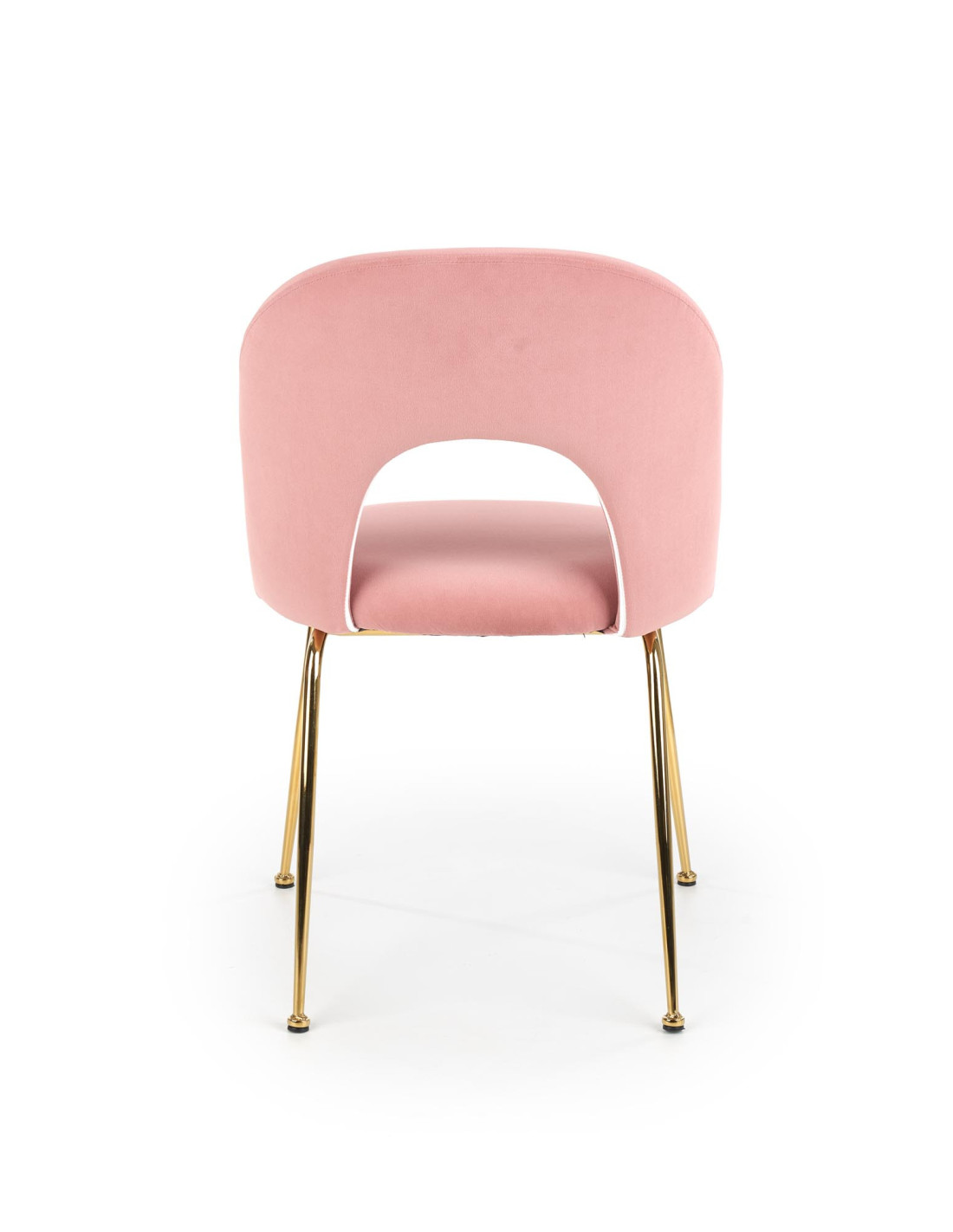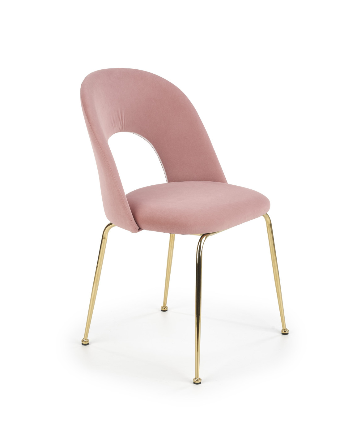 Krzesło K385 wyróżnia się zaokrąglonym kształtem siedziska, oparciem z wycięciem oraz złotymi nogami, które nadają mu luksusowy charakter.
