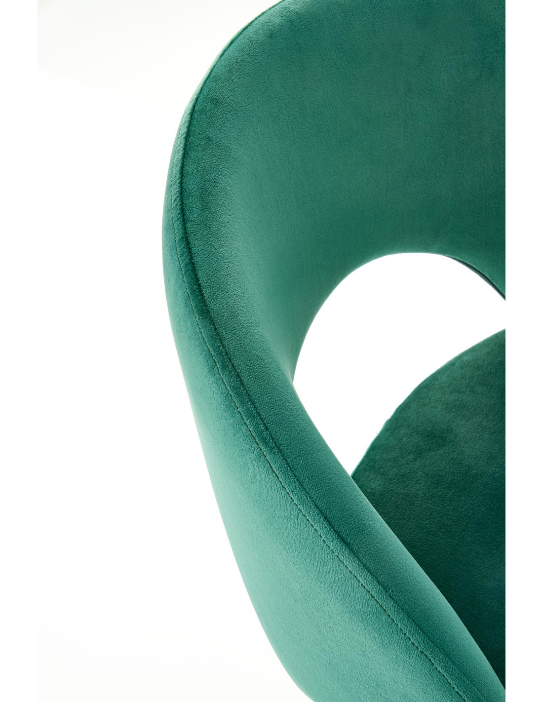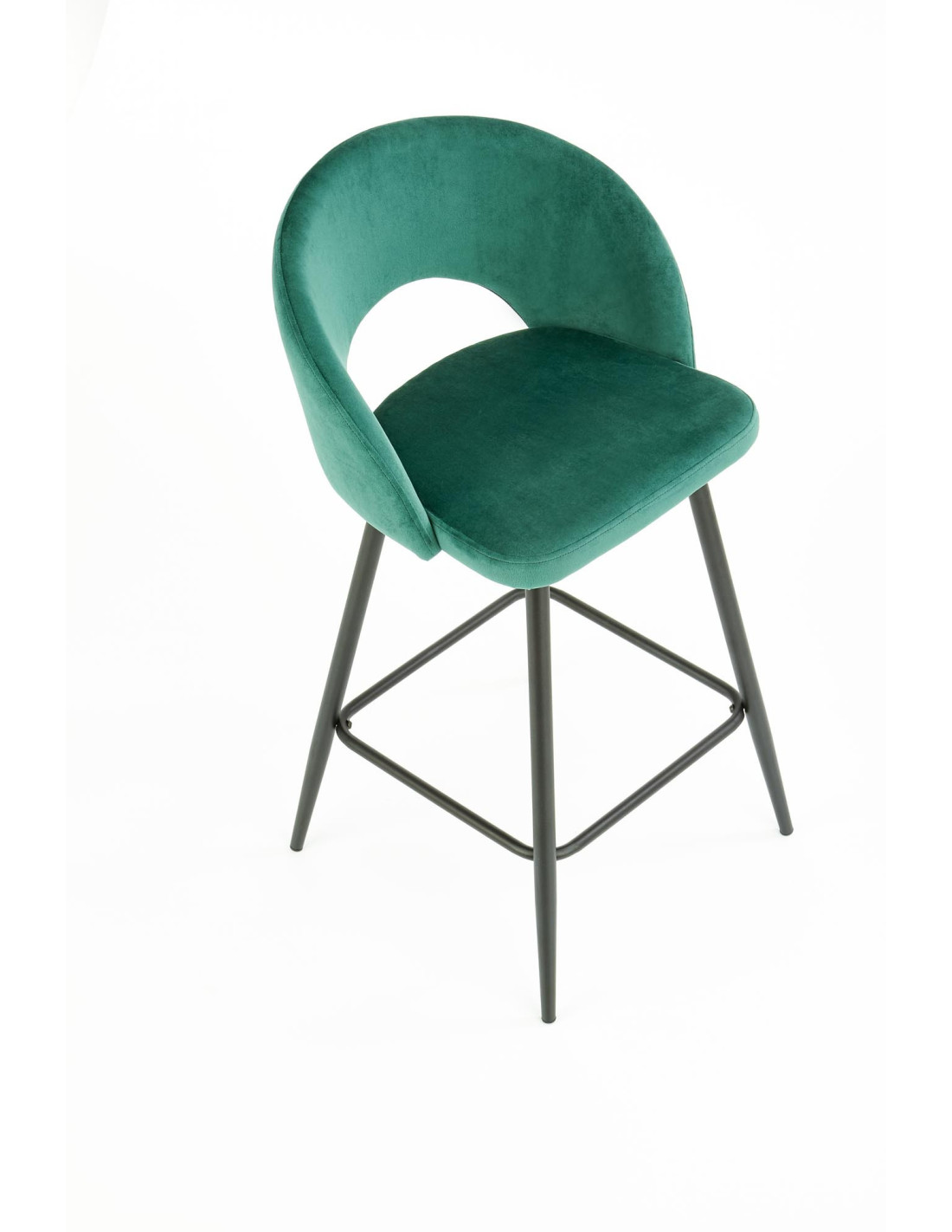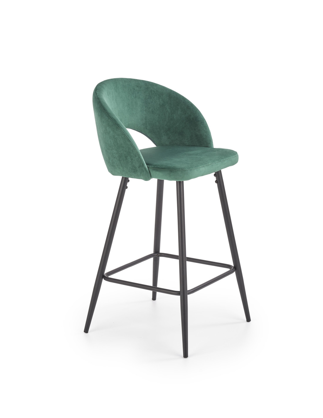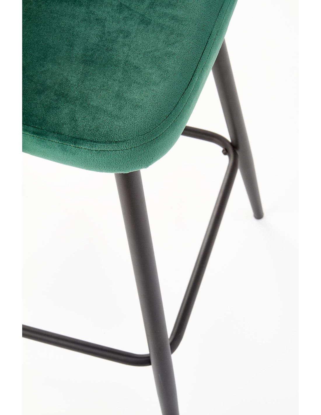Sprawdź hoker H96, który doskonale łączy nowoczesny styl z elegancją. Miękkie, aksamitne obicie w ciemnozielonym kolorze w połączeniu z zaokrąglonym siedziskiem i wycięciem w dolnej części oparcia sprawia, że każda chwila spędzona na tym hokerze to prawdziwa przyjemność. Smukłe, metalowe nogi w czarnym kolorze z dodatkowymi podpórkami dla stóp zapewniają stabilność oraz komfort użytkowania.