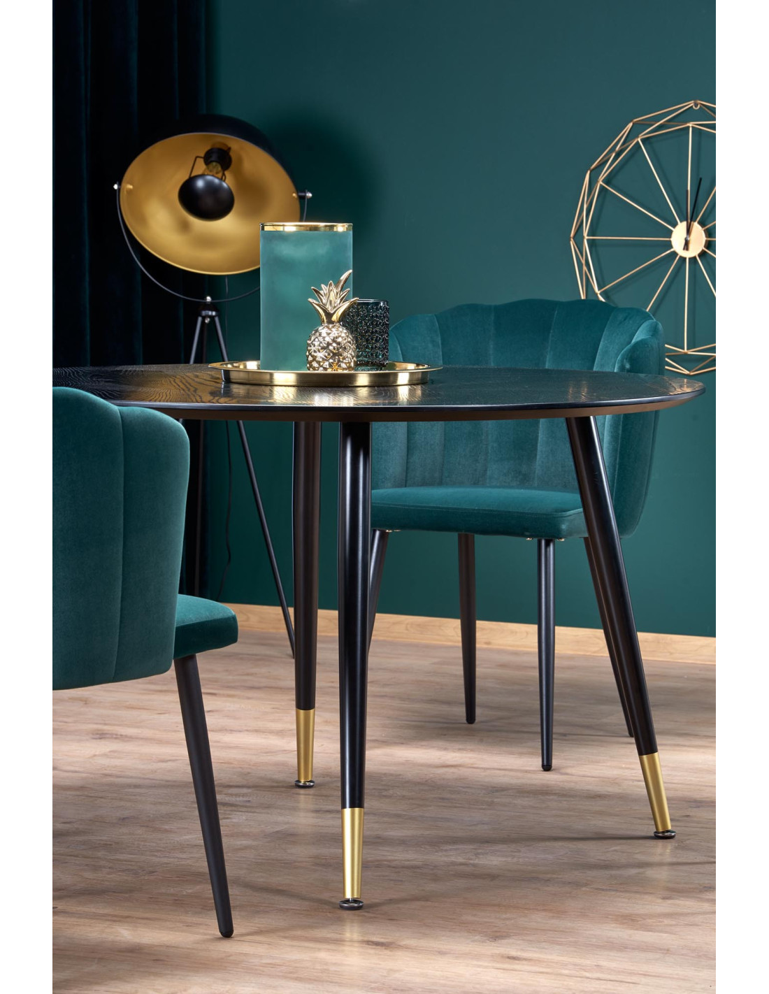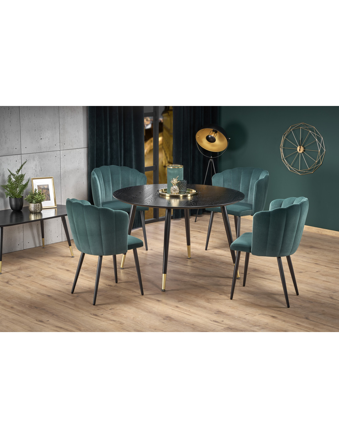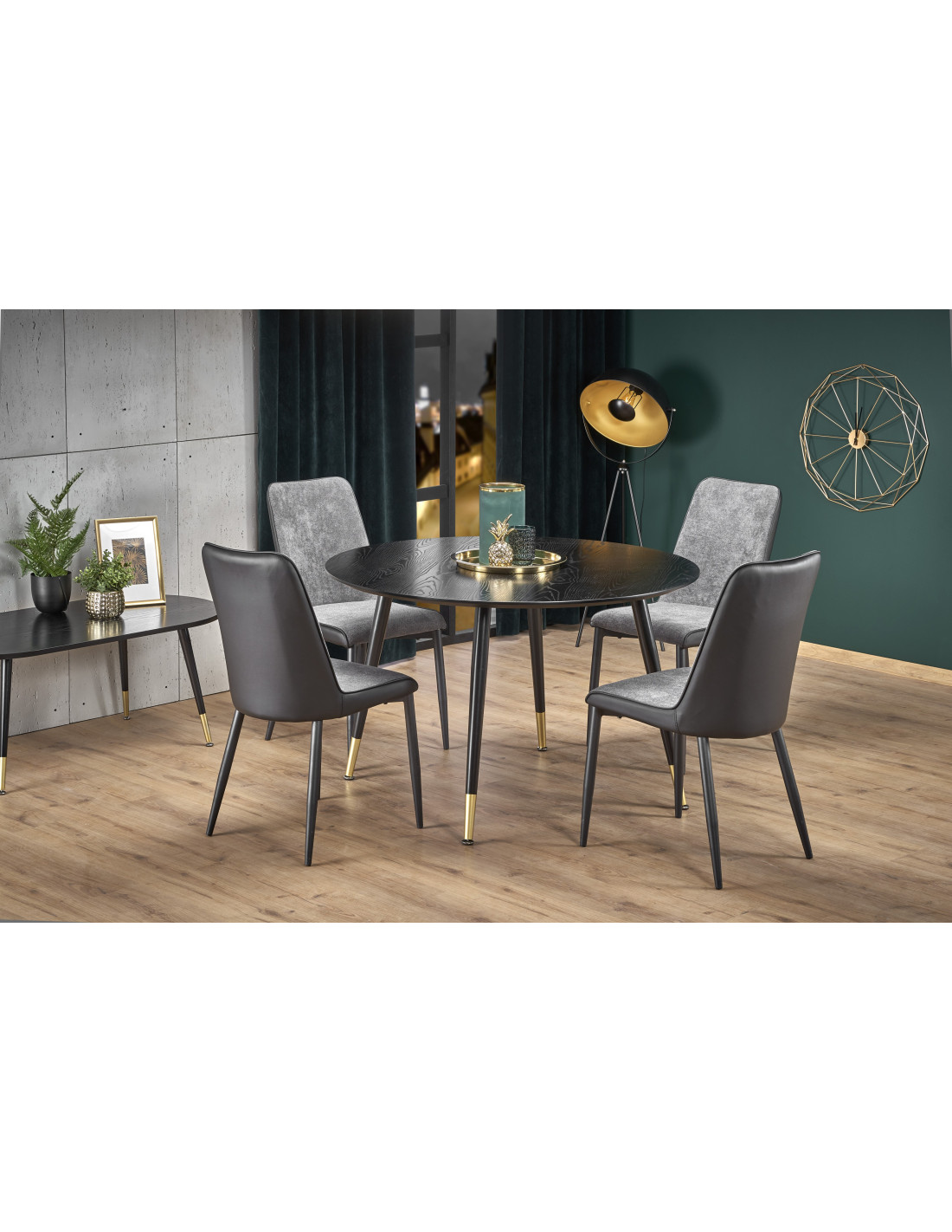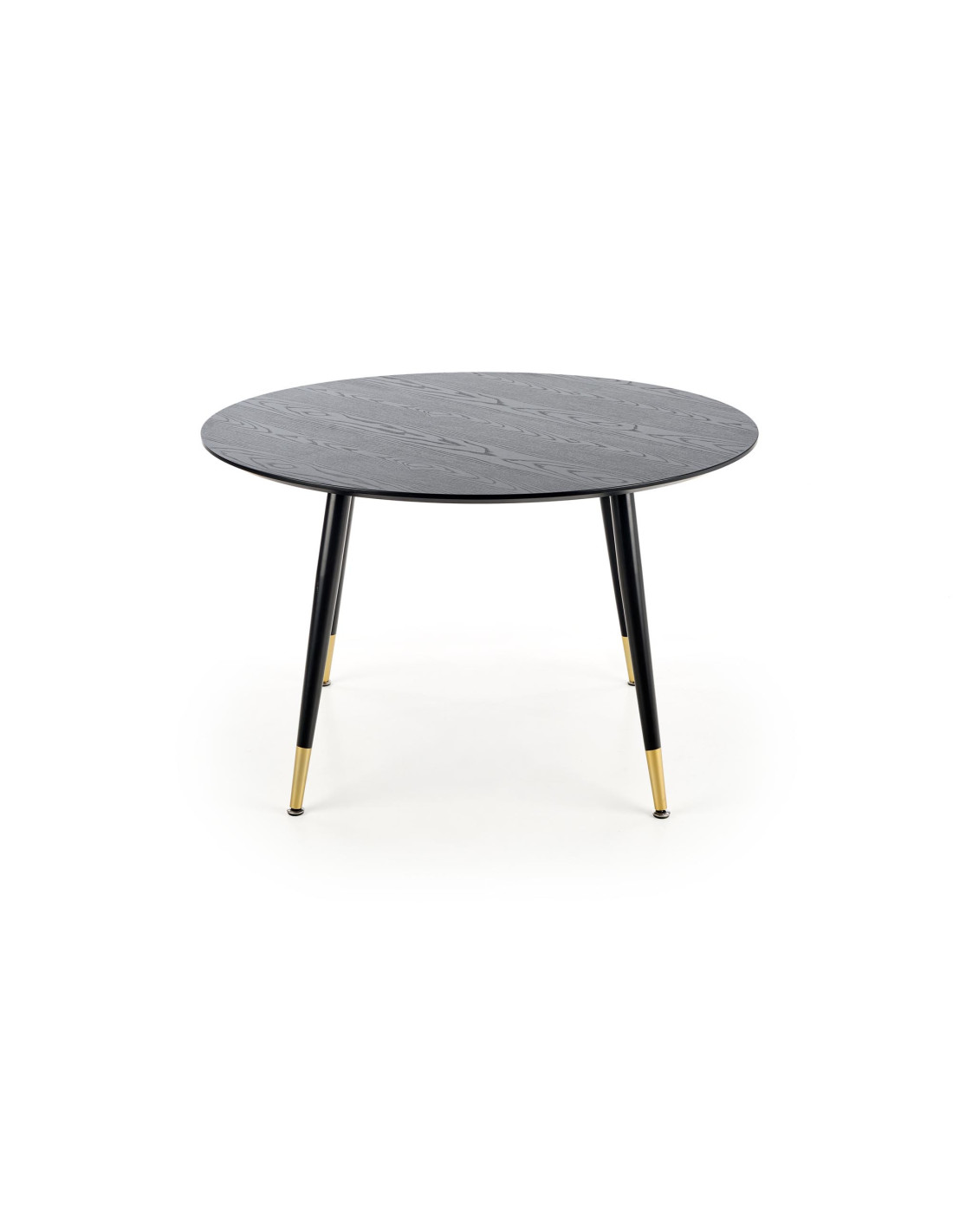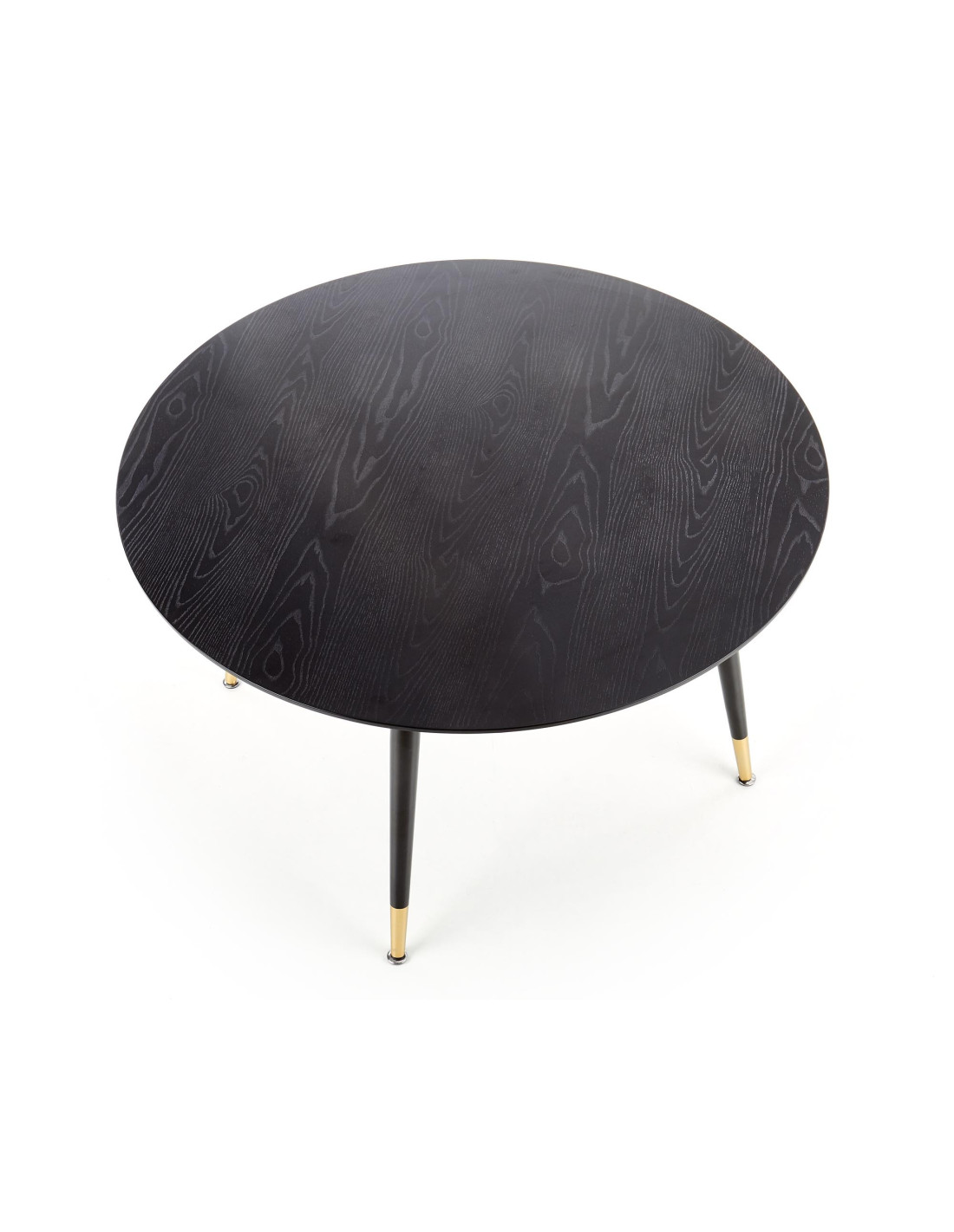 Szukasz rozwiązania? Oto ono! Stół okrągły EMBOS o średnicy 120 cm to doskonałe połączenie nowoczesnego luksusu z eleganckim wyglądem. Blat wykonany z MDF lakierowanego w głębokim czarnym kolorze, z widoczną teksturą drewna, nadaje mu niepowtarzalny charakter. Smukłe nogi w tym samym odcieniu, zakończone złotymi akcentami, dodają stołowi luksusowego wyrazu, sprawiając, że staje się on centralnym punktem każdej przestrzeni.