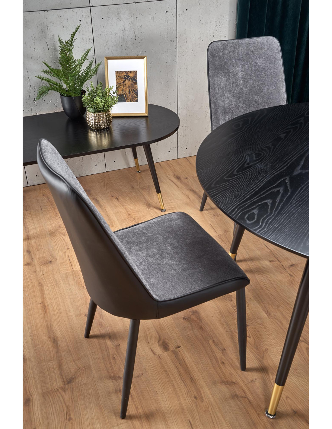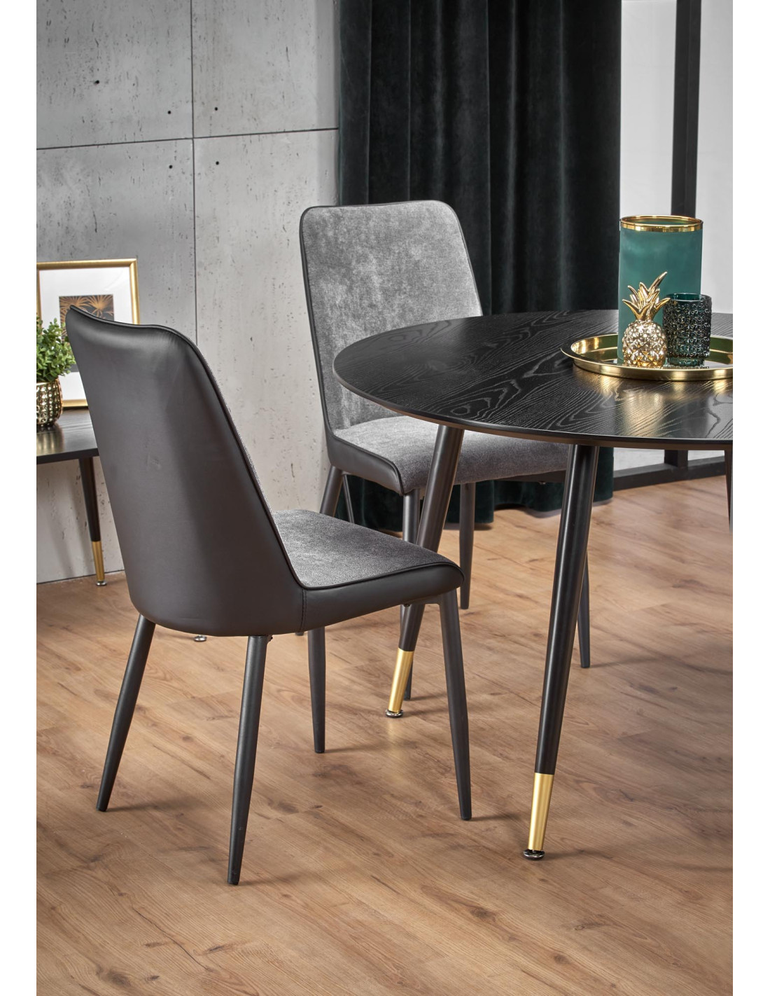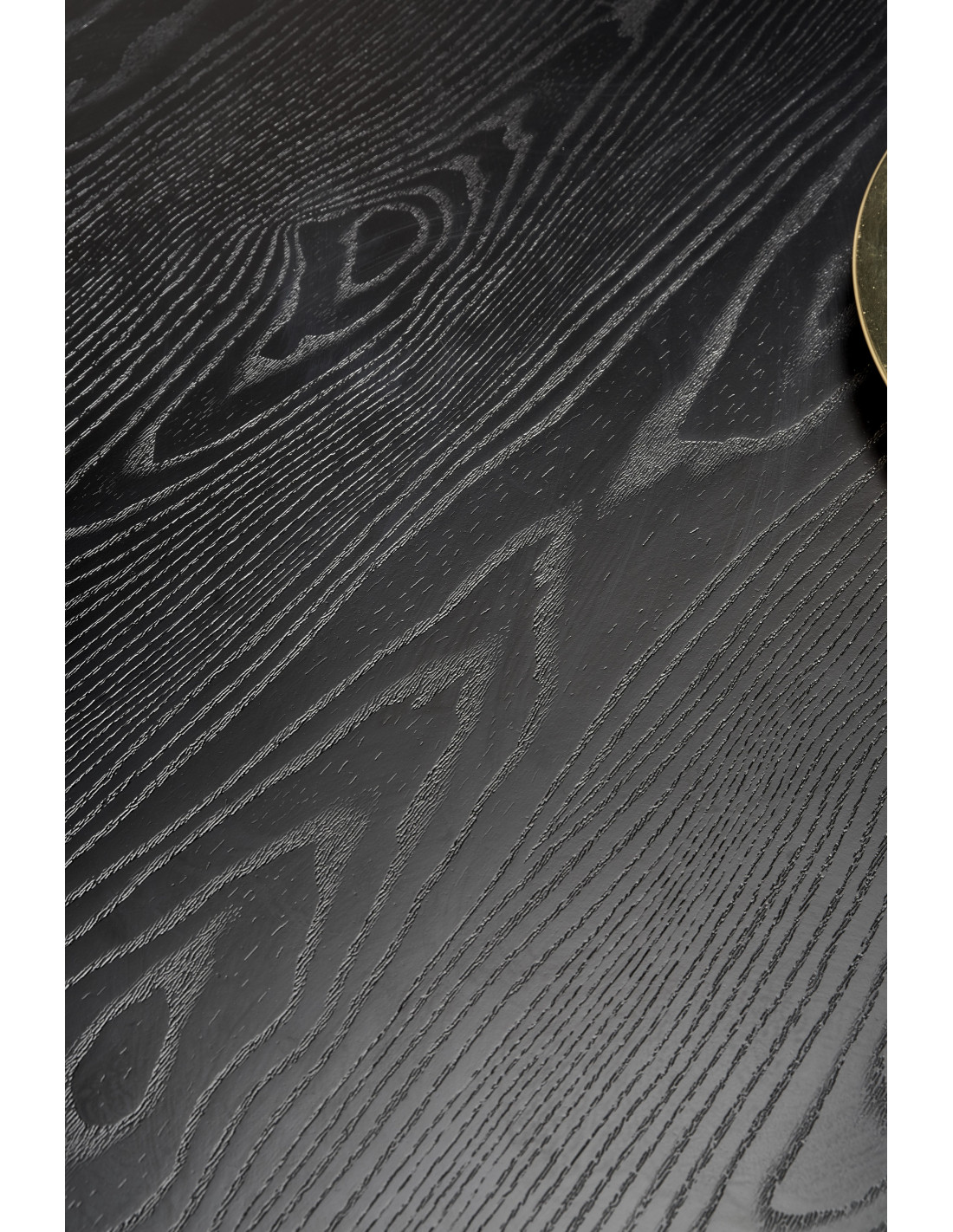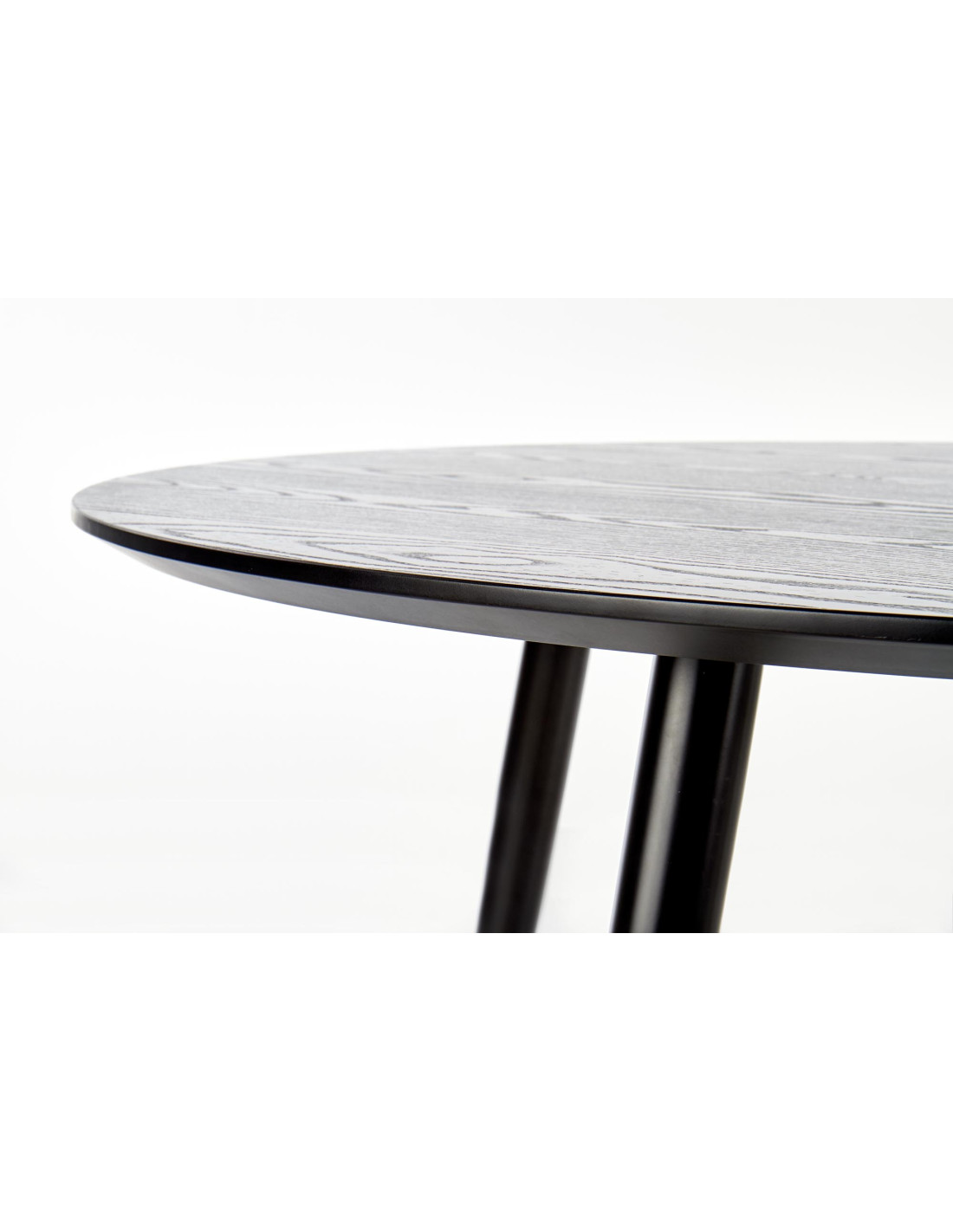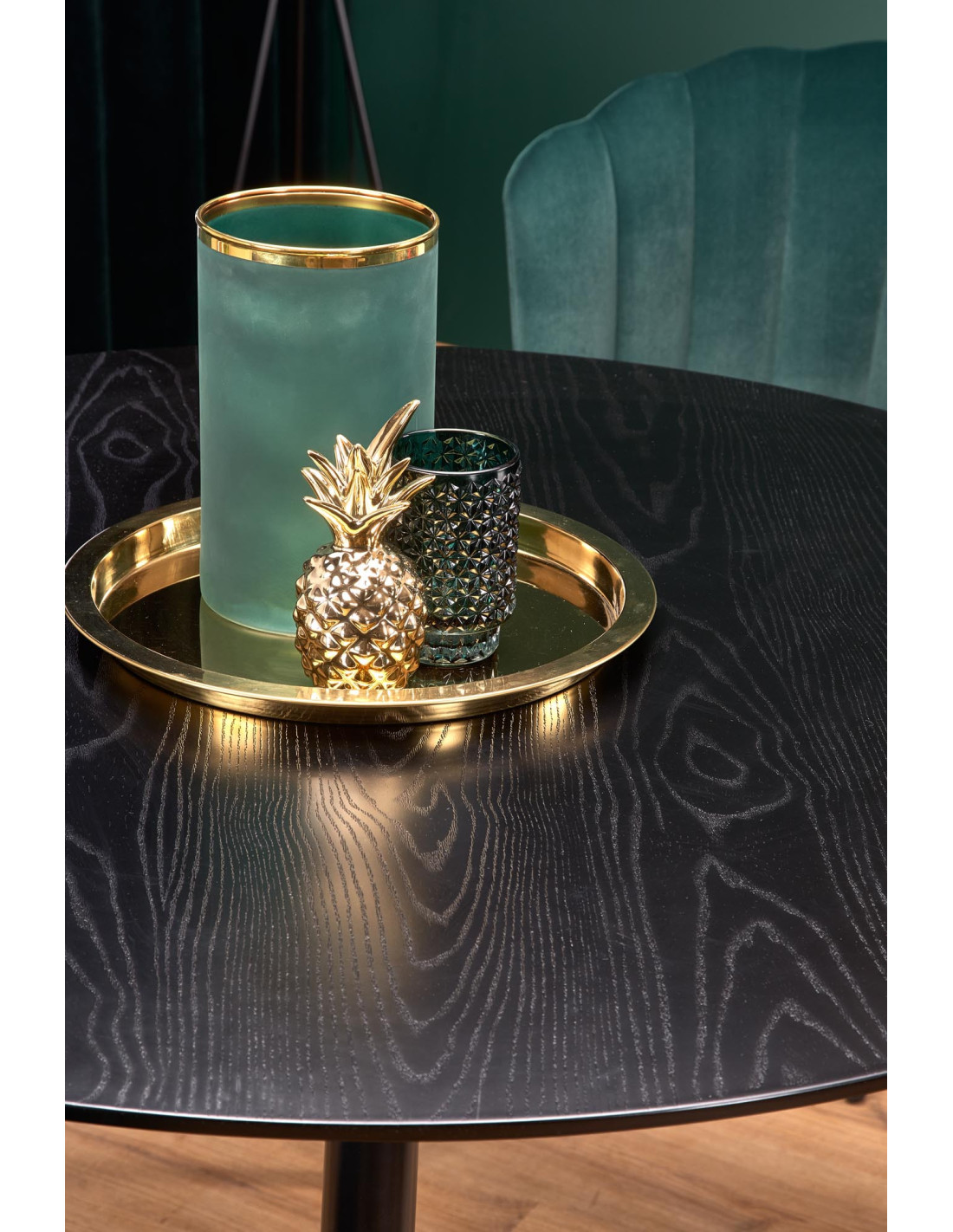 Szukasz rozwiązania? Oto ono! Stół okrągły EMBOS o średnicy 120 cm to doskonałe połączenie nowoczesnego luksusu z eleganckim wyglądem. Blat wykonany z MDF lakierowanego w głębokim czarnym kolorze, z widoczną teksturą drewna, nadaje mu niepowtarzalny charakter. Smukłe nogi w tym samym odcieniu, zakończone złotymi akcentami, dodają stołowi luksusowego wyrazu, sprawiając, że staje się on centralnym punktem każdej przestrzeni.