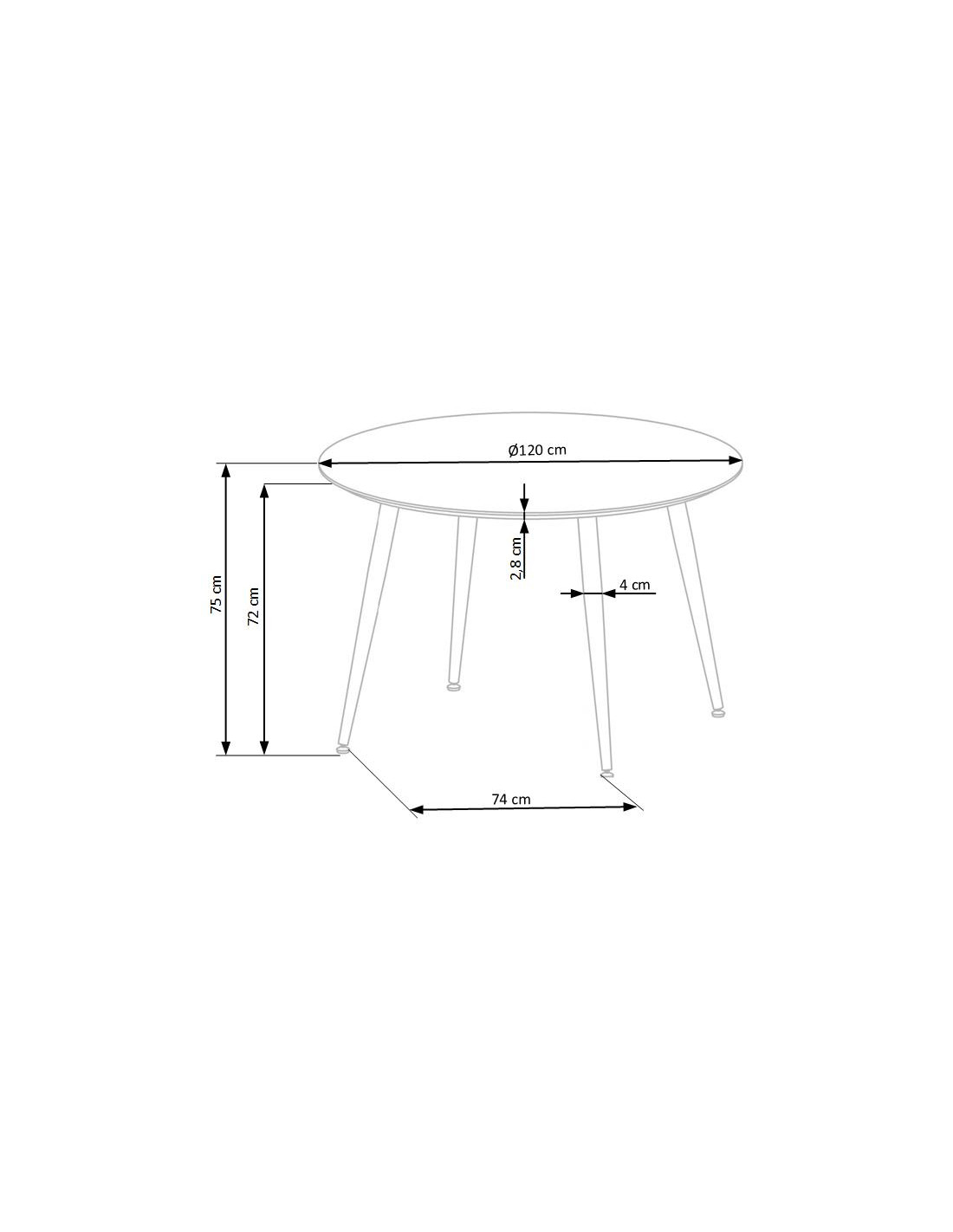 Średnica blatu wynosi 120 cm, a wysokość stołu to 75 cm.